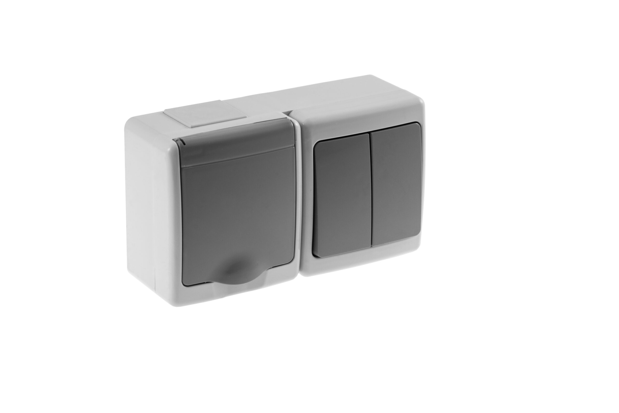 Wyłącznik BETA pojedynczy, świecznikowy i gniazdo BETA pojedyncze, szare, szara klapka, IP44