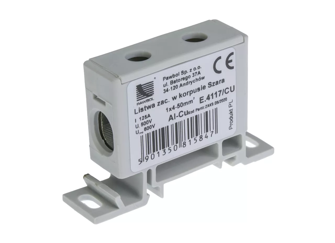 Listwa zaciskowa w korpusie, Al/Cu, 1x4-50mm2, 125A, 600V, szara