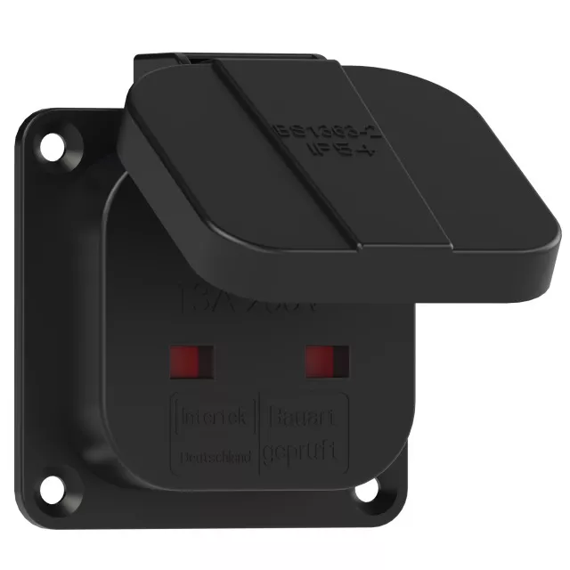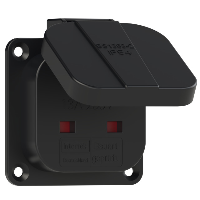 Gniazdo tablicowe wersja ANGIELSKA 13A 2P+Z 230V 50/60Hz IP54, boczne podłączenie kołnierz 64X64, styki niklowane