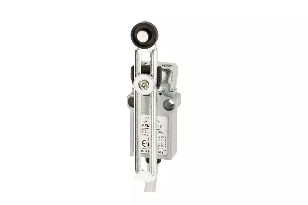 Wyłącznik krańcowy 1R 1Z wolnoprzełączający regulowana dźwignia z rolką z tworzywa Ø18 PEM2G51X A37-B95X