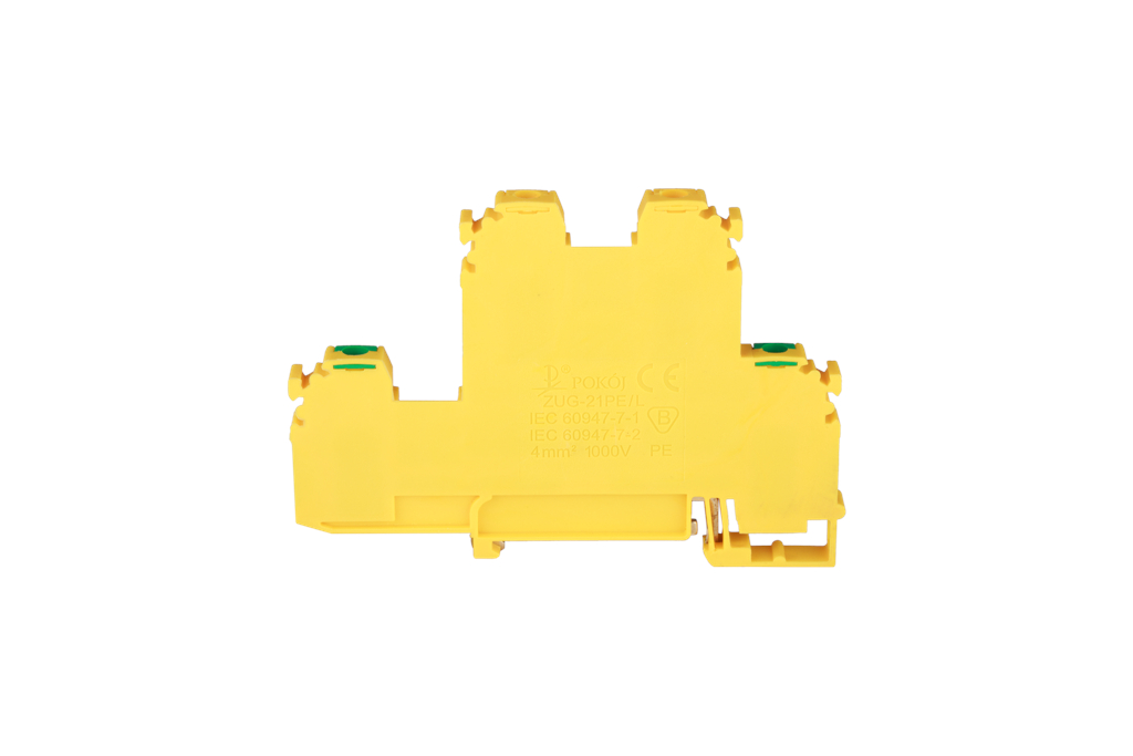 Złączka szynowa ochronna 4-przewodowa 2-piętrowa z czterema zaciskami zmostkowany dolny tor prądowy do szyny montażowej 4mm2 żółto-zielony V0 ZUG-21PE/L A00-AB3Z