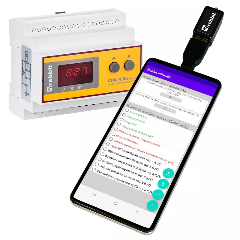 Programowanie zegara astronomicznego CPA 4.0 może odbywać się za pomocą modułu infraRED, który jest wyposażony w odbiornik na podczerwień. Zestaw składa się z modułu infraRED, specjalnej przejściówki USB OTG typu C lub micro-B oraz aplikacji