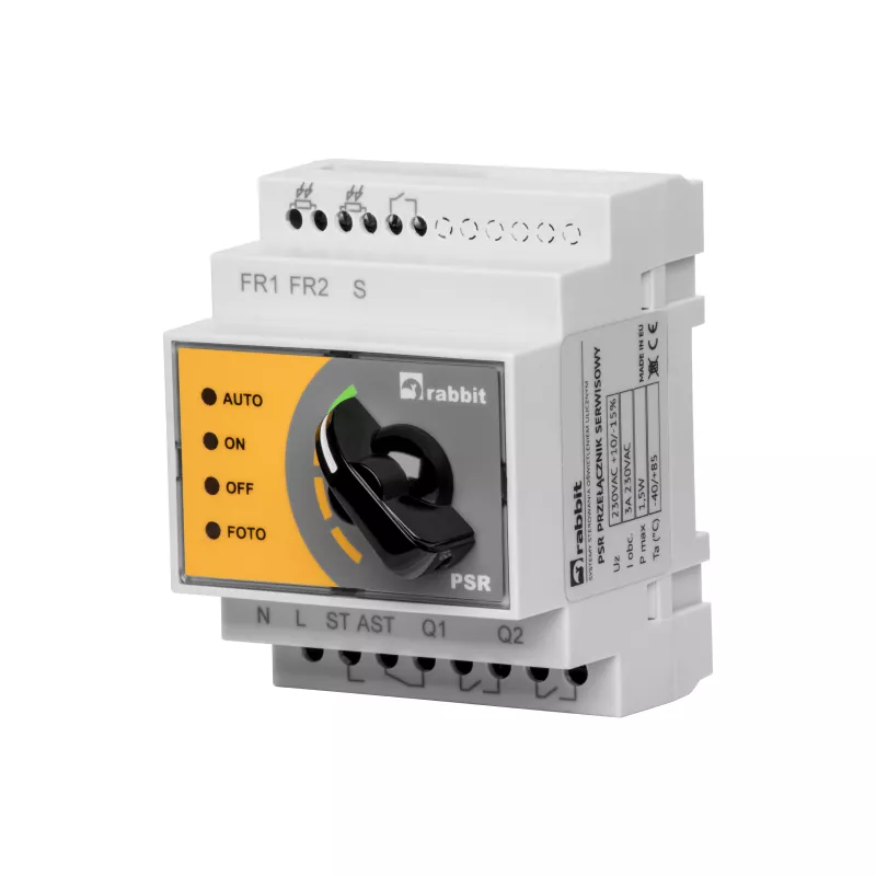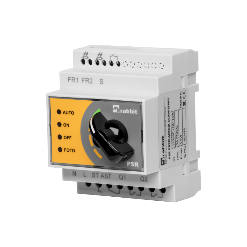 Przełącznik serwisowy PSR to urządzenie służące do awaryjnego sterowania oświetleniem ulicznym. W przypadku awarii podstawowego systemu sterowania przejmuje kontrolę nad pracą oświetlenia. Dzięki takiemu rozwiązaniu użytkownik ma czas na zlokalizowanie, zdiagnozowanie i usunięcie usterki. To niewielkie urządzenie w prosty sposób może zostać zamontowane w każdej szafie oświetleniowej. Zaletą układu jest możliwość podłączenia dwóch czujników pomiarowych jednocześnie. W przypadku awarii jednego czujnika lub aktu wandalizmu, w którym jeden z czujników zostaje uszkodzony drugi przejmuje wszystkie funkcje i samodzielnie steruje oświetleniem.