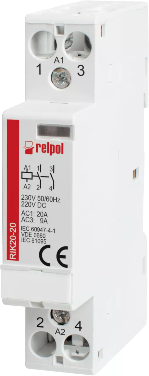 Stycznik instalacyjny, 2-biegunowy, 2 N/O (1-2, 3-4). Ith - 20 A. AC1/AC7a - 4 kW / 230 V. AC3/AC7b - 1,3 kW / 230 V. DC1 - 0,5 A / 220 V. Dla dwóch biegunów połączonych w szereg: DC1 - 1,5 A / 220 V. Cewka 24 V AC/DC - zaciski: (+)A1 - (-)A2. Wymiary: 85 x 17,5 x 65 mm. Montaż na szynie 35 mm. IP 20.