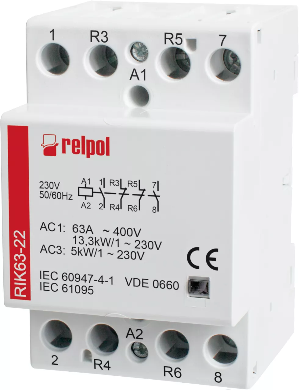 Stycznik instalacyjny, 4-biegunowy, 3 N/O (1-2, 3-4, 5-6) + 1 N/Z (R3-R4). Ui - 500 V. Ith - 63 A. AC1/AC7a - 24 kW / 230 V; 40 kW / 400 V. AC3/AC7b - 8,5 kW / 230 V; 15 kW / 400 V. Cewka 230 V AC/DC - zaciski: A1 - A2. Wymiary: 84 x 53,3 x 65,5 mm. Montaż na szynie 35 mm. IP 20.