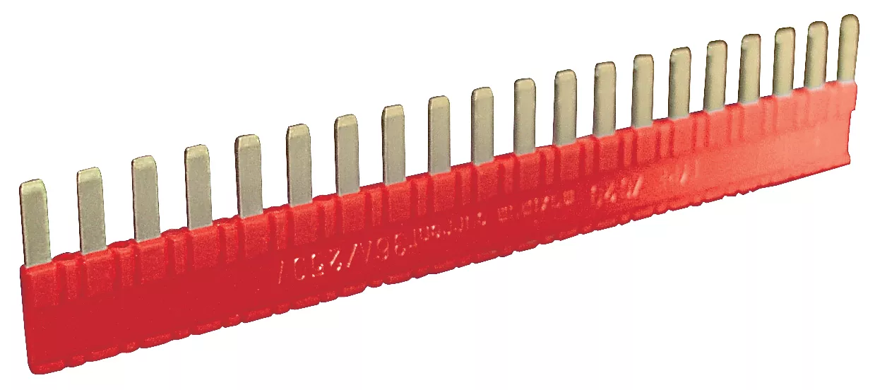 Złącze grzebieniowe 20-zębowe, do mostkowania wspólnych sygnałów wejść lub wyjść, kolor czerwony. Do PI6, PIR6W, PIR6WB, PIR6WT, PIR6WBT. Maksymalny dopuszczalny prąd 36 A / 250 V AC.