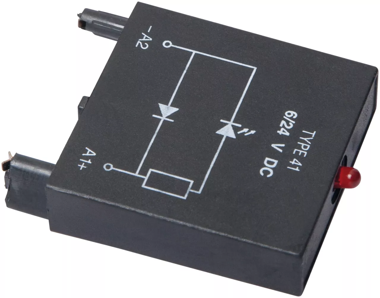 Moduły sygnalizacyjne/przeciwprzepięciowe: typu 41 do gniazd GZP8 i GZP11 oraz przekaźnkików R15 2P i R15 3 P. Moduł LD - LED czerwona + dioda tłumiąca D, polaryzacja N: +A1/-A2, 6/24 V DC. Ogranicza przepięcia na cewkach DC. Sygnalizuje obecność napiecia na cewce