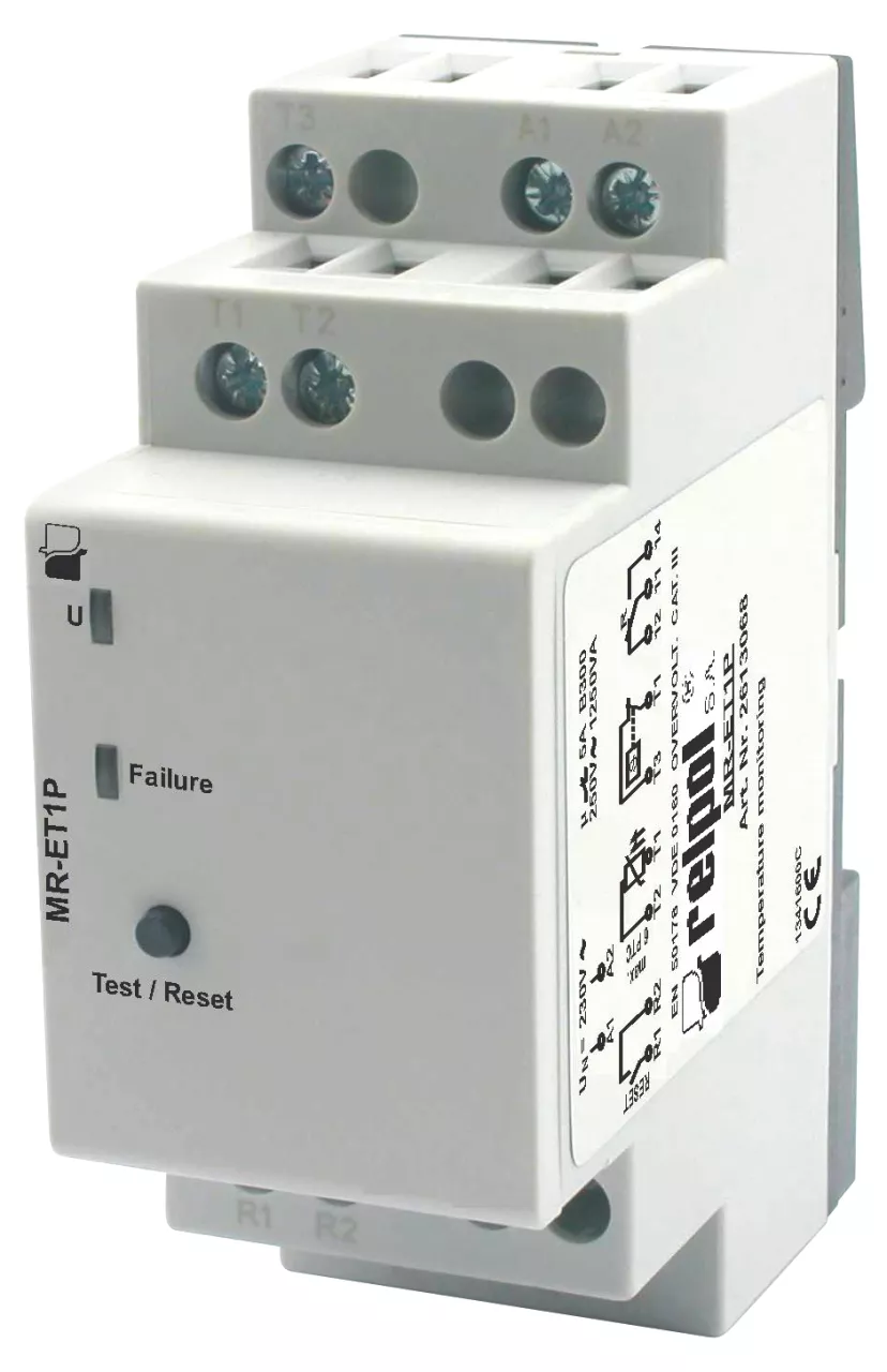 Przekaźnik nadzorczy, jednofunkcyjny: 1P - jeden zestyk przełączny. Nadzór temperatury silnika poprzez podłączone czujniki PTC (maks. 6 czujników) lub zestykiem termicznym. Wejście - zaciski: A1 - A2, napięcie zasilania przekaźnika - 230 V AC. Obwody pomiarowe - zaciski: T1-T2 - obwód z czujnikami temperatury; wartość reakcji - ³ 3,6 kW, wartość powrotu - £ 1,65 kW; zaciski: T1-T3 - obwód z zestykiem termicznym, napięcie pomiarowe T1-T2 - £ 7,5 V przy R £ 4 kW. Posiada przycisk TEST / RESET pamięci błędu. Wyjście: zestyk 1P - zaciski: 11-12-14; AC1 - 5 A / 250 V. Wymiary: 87 x 35 x 65 mm. Obudowa - moduł instalacyjny. IP 20.