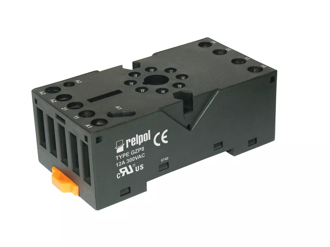 Gniazdo wtykowe do przekaźników R15 2P (wersja do gniazd) - kolor czarny, szerokość 38,2 mm. Bez separacji obwodów. Wejście / cewka - zaciski: (+)A1(2), (−)A2(7) - zdublowany. Wyjścia / styki - zaciski: 11(1) - 12(4) - 14(3); 21(8) - 22(5) - 24(6). Obciążalność toru - 12 A / 300 V AC. Wymiary: 73 x 38,2 x 27,2 mm. Montaż na szynie 35 mm lub na płycie montażowej dwoma wkrętami M3. Wymiary zestawu: gniazdo GZP8 + przekaźnik R15 2P + obejma GZP-0054 : 73 x 38,2 x 85,6 mm. Uwaga: do gniazda należy oddzielnie zamawiać obejmę sprężynową typu GZP-0054 (zwiększa wysokość zestawu gniazdo + przekaźnik o około 4 mm). W gnieździe można instalować moduł czasowy COM3. Dla zestawu IP20. Pasujące moduły do gniazda: moduł typu 21 i 41.