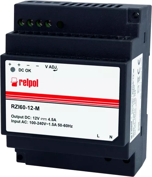 Zasilacz impulsowy w plastikowej obudowie modułowej, bezpośredni montaż na szynie 35mm. (możliwośc montażu natablicowego). Uniwersalne napięcie zasilania 90-264VAC (125-375VDC). Obwód wyjściowy : 12VDC; 4,5A; Moc 60W. II klasa ochronności. Zabezpieczenia: przepięciowe, przeciążeniowe, temperaturowe. Szerokość: 71mm