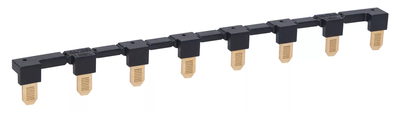 Złącze 8-polowe ZGZP80-8 BK (kolor czarny dedykowane do przekaźników interfejsowych w technologii push-in: PI84, PI85, PI84P, PI85P. Mostkuje wspólne sygnały wejść (zaciski cewki A1 lub A2), maksymalny dopuszczalny prąd 10 A / 250 V AC, możliwość połączenia 8 gniazd lub przekaźników,
