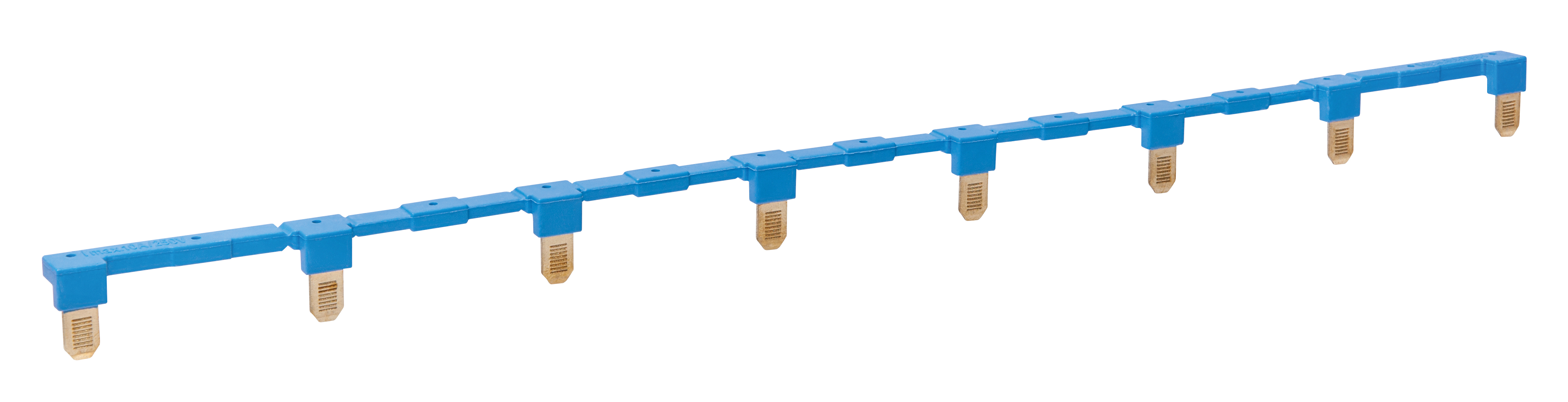 Złącze 8-polowe ZGZP4-8 BE (kolor niebieski) dedykowane do przekaźników interfejsowych w technologii push-in: PIR2, PIR4. Mostkuje wspólne sygnały wejść (zaciski cewki A1 lub A2), maksymalny dopuszczalny prąd wynosi 10 A / 250 V AC, możliwość połączenia 8 gniazd lub przekaźników,