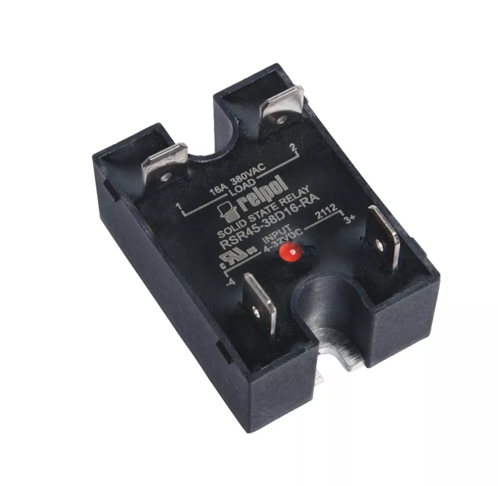 Mini przekaźnik półrzewodnikowy (30 x 20,5 x 38,5), jednofazowy RSR45: napięcie sterujące 4-32V DC, prąd obciążenia 25A, napięcie obciążenia 24-440V AC, załączany w zerze.