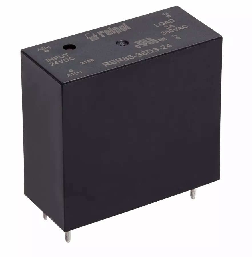 Przekaźnik półprzewodnikowy miniaturowy RSR85: napięcie sterujące 4-6V DC, prąd obciążenia 3A, napięcie obciążenia 24-280V AC, załączany w zerze, wysokość15,7mm, do obwodów drukowanych.