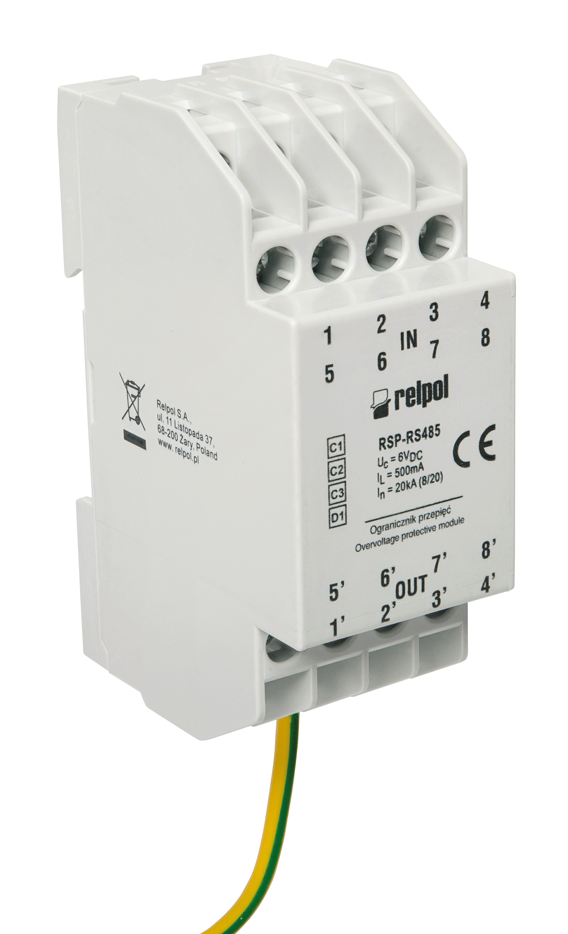 Ogranicznik przepięć do linii sygnałowych w systemach trasmisji danych typu IT, Bus. Miejsce zastosowania: systemy fieldbus (protokoły RS485, RS 422, V.11). Znamionowe napięcie pracy: 5 V DC. Maksymalne napięcie pracy ciągłej: 6 V DC. Czas zadziałania ochrony przeciwprzepięciowej: (5, 6, 7, 8, SG) < 1 ns.