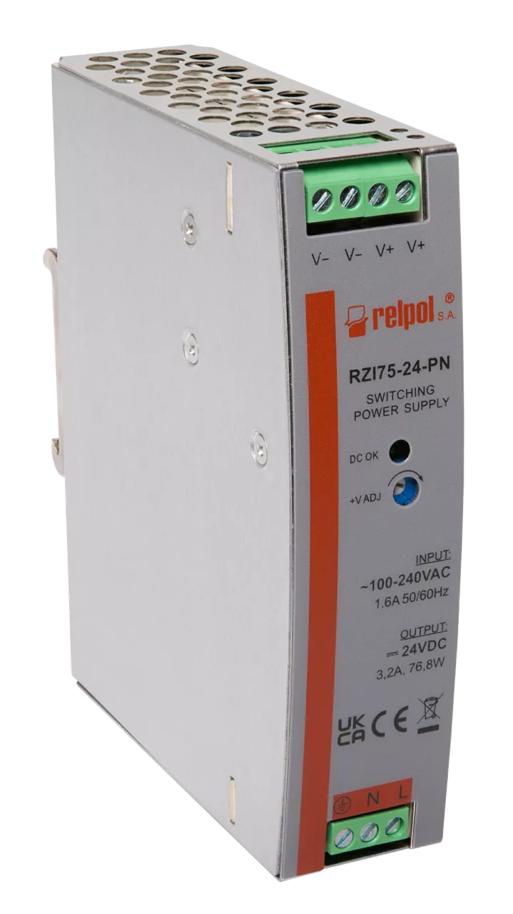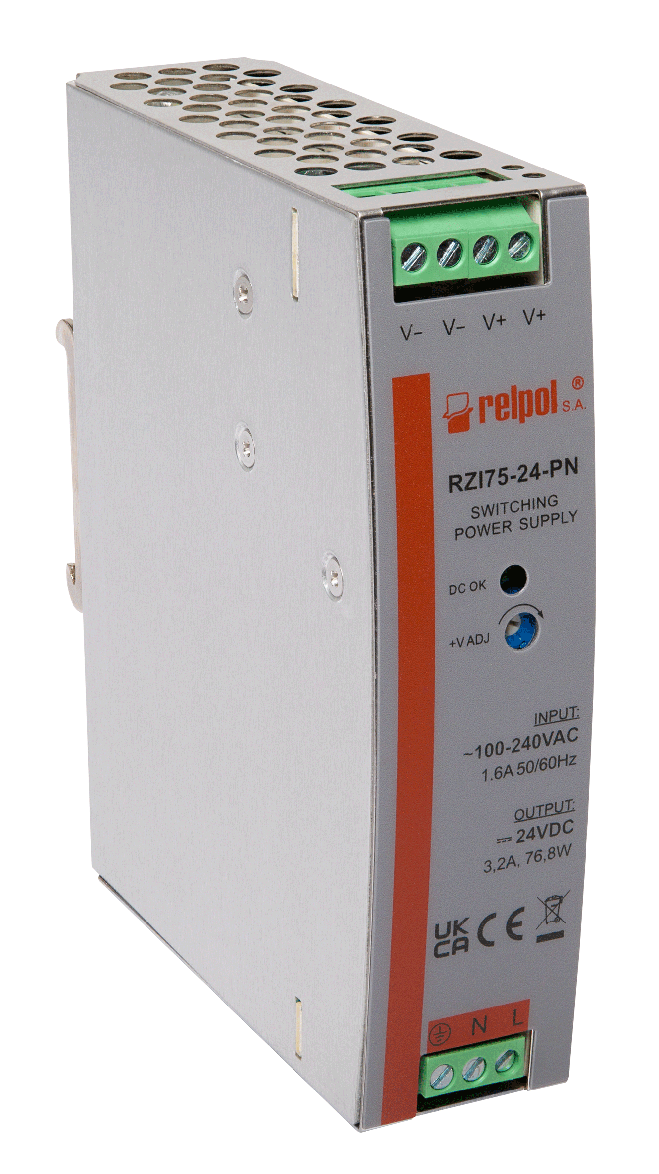 Przemysłowy zasilacz impulsowy w kompaktowej metalowej obudowie, bezpośredni montaż na szynie 35mm. Wysoka sprawność >88%. Uniwersalne napięcie zasilania : 90-264VAC (120-375 VDC). Obwód wyjściowy: 24VDC; 3,2A; Moc 76,8W. Zabezpieczenia: przepięciowe, przeciążeniowe, temperaturowe. Szerokość: 32mm.