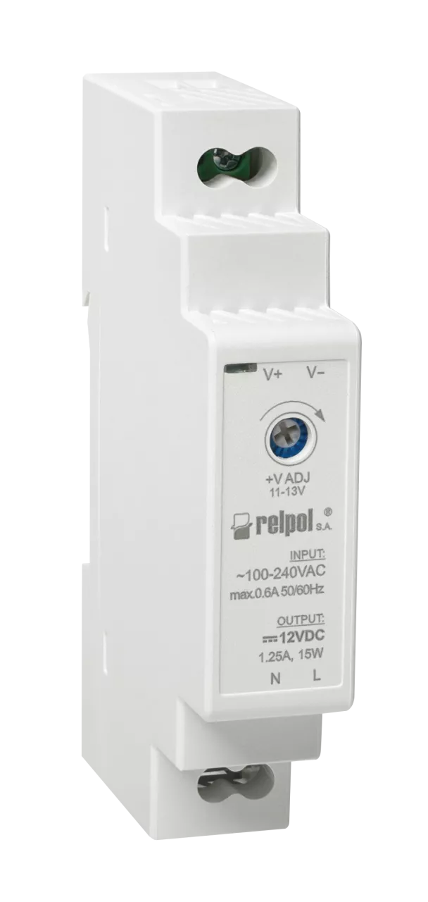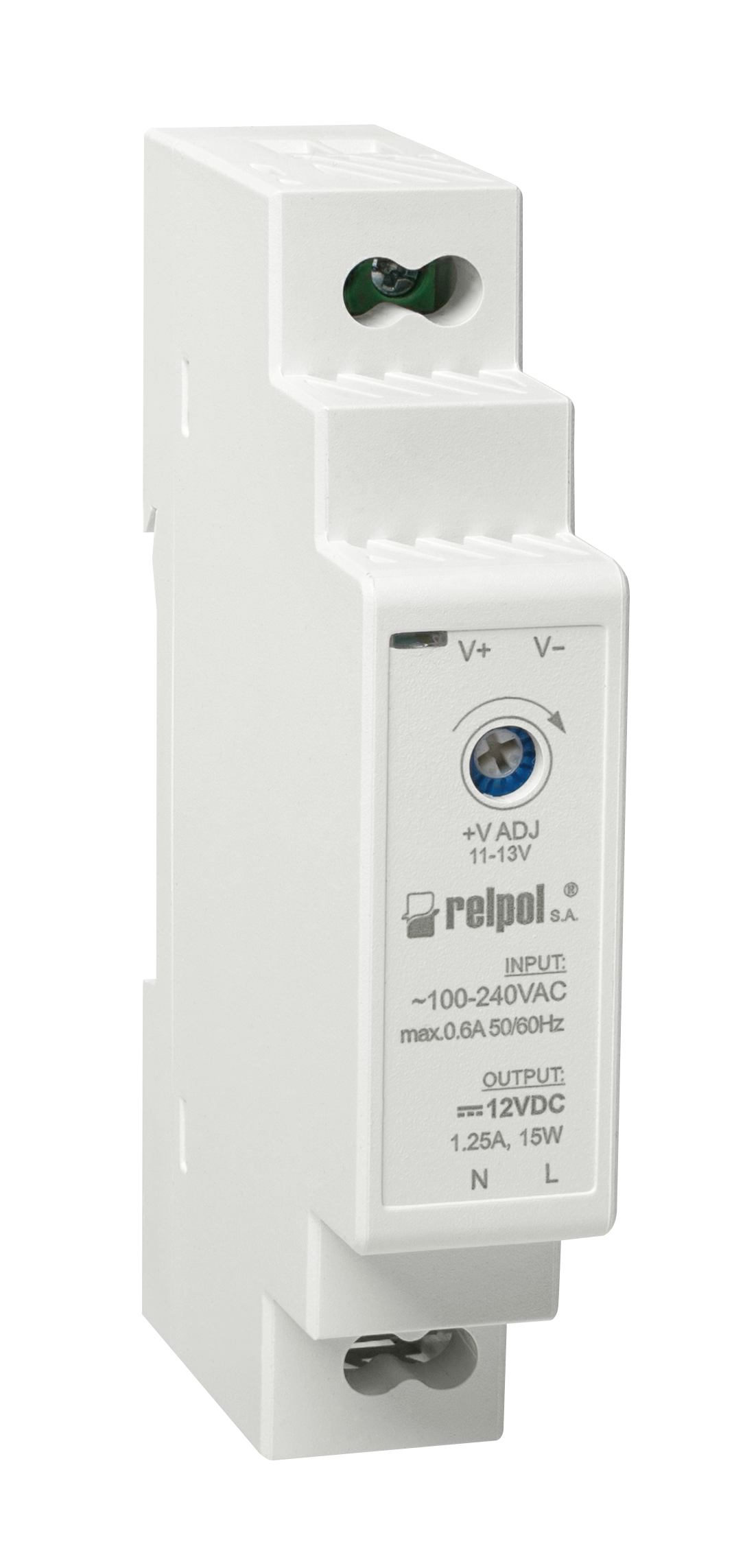 Zasilacz impulsowy w plastikowej obudowie modułowej, bezpośredni montaż na szynie 35mm. Uniwersalne napięcie zasilania 90-264VAC (125-375VDC). Obwód wyjściowy : 12VDC; 1,25A; Moc 15W. II klasa ochronności. Zabezpieczenia: przepięciowe, przeciążeniowe, temperaturowe. Szerokość: 17,9mm