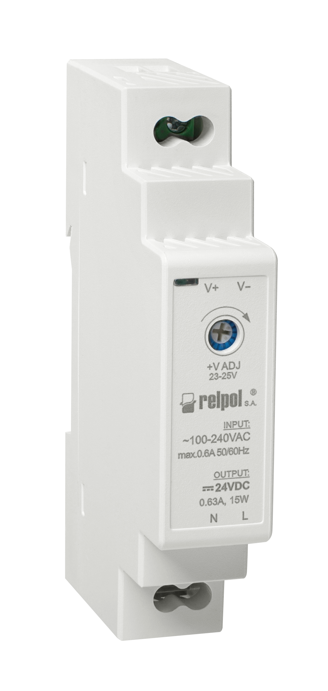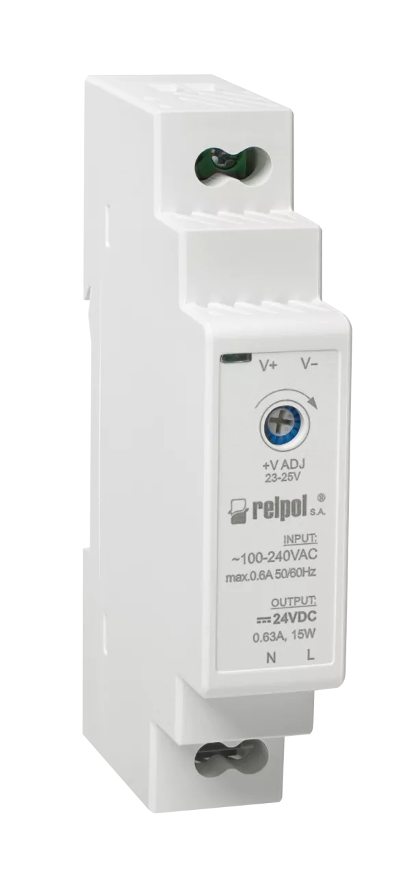 Zasilacz impulsowy w plastikowej obudowie modułowej, bezpośredni montaż na szynie 35mm. Uniwersalne napięcie zasilania 90-264VAC (125-375VDC). Obwód wyjściowy : 24VDC; 0,63A; Moc 15W. II klasa ochronności. Zabezpieczenia: przepięciowe, przeciążeniowe, temperaturowe. Szerokość: 17,9mm