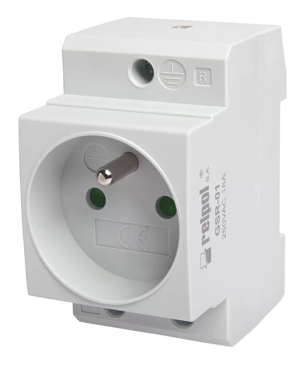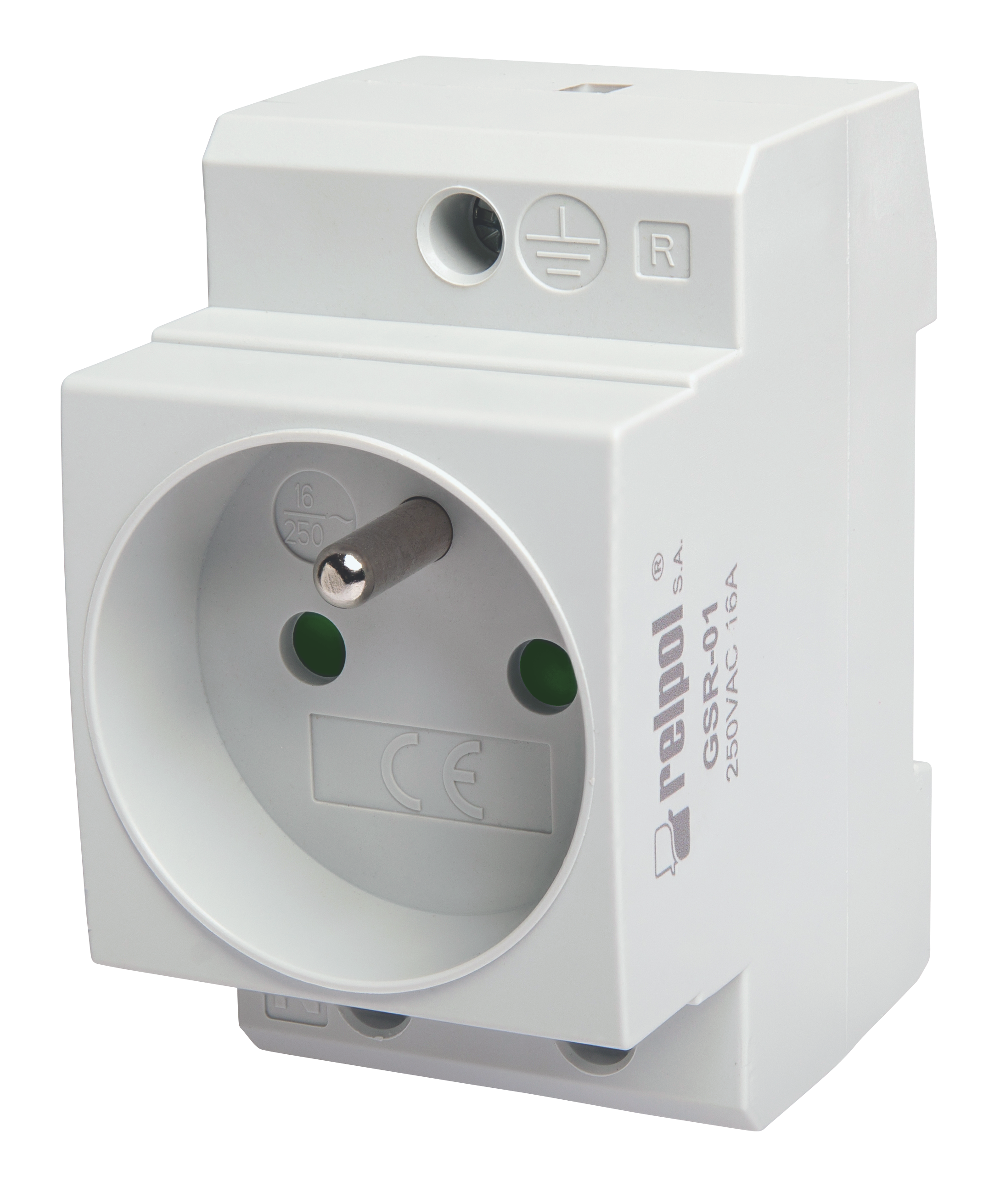 Gniazdo modułowe na szynę TH-35 do rozdzielni typu E, Napięcie znamionowe 250V, rodzaj napięcia AC, bolec uziemiający , Prąd znamionowy 16A, Stopień ochrony IP20
