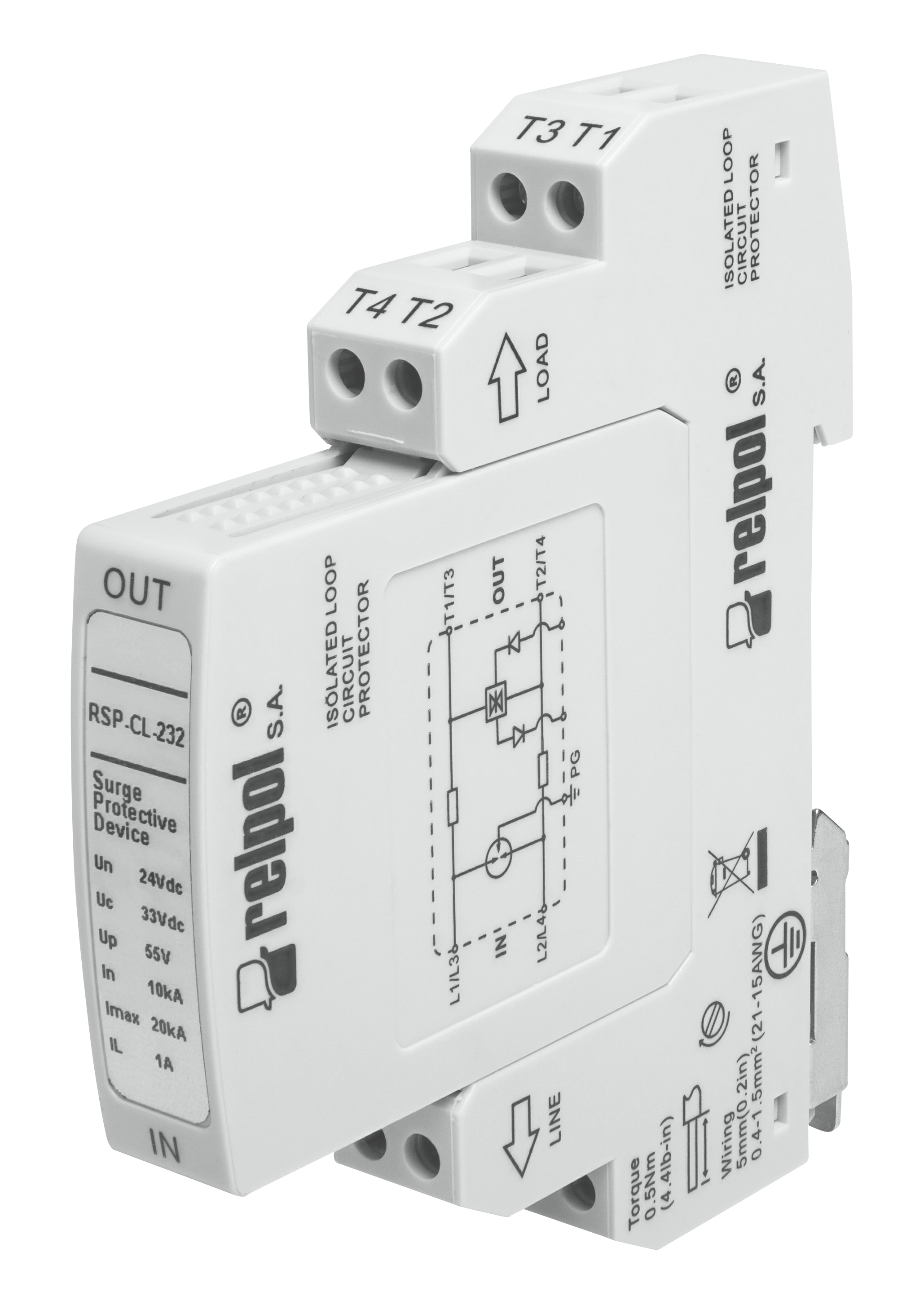 Ogranicznik przepięć do ochrony przeciwprzepięciowej w systemach trasmisji danych typu IT, Bus. Miejsce zastosowania: w systemach danych i komunikacji: 0-20 mA, 4-20 mA pętla prądowa, TTY 4-20 mA, TTY, TTL, V24 (RS232C). Znamionowe napięcie pracy: 24 V DC. Maksymalne napięcie pracy ciągłej: 33 V DC / 23,3 V AC.