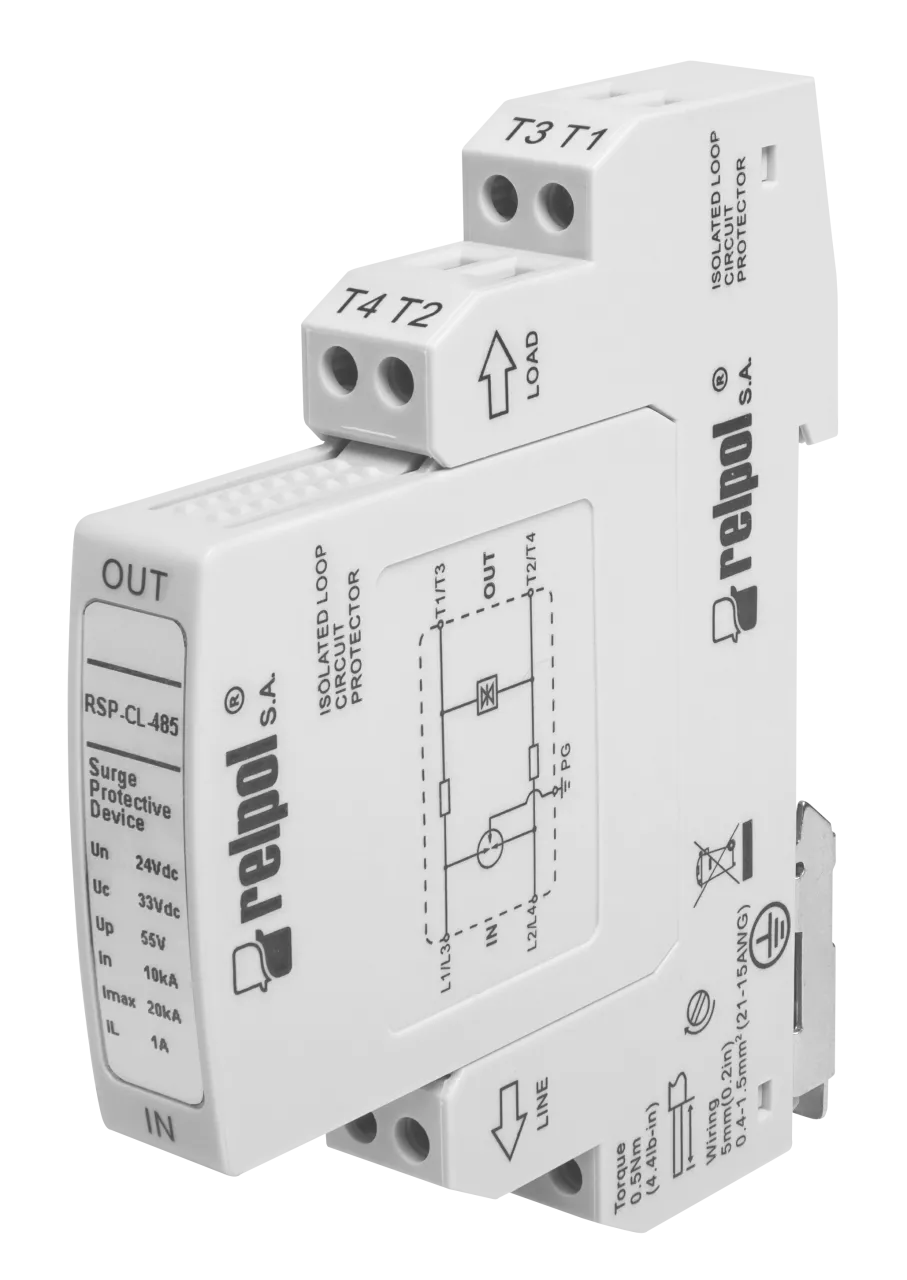 Ogranicznik przepięć do ochrony przeciwprzepięciowej w systemach trasmisji danych typu IT, Bus. Miejsce zastosowania: 4-20 mA pętla prądowa, komunikacja analogowa/cyfrowa, RS485, interfejs RS422 (V11). Znamionowe napięcie pracy: 24 V DC. Maksymalne napięcie pracy ciągłej: 33 V DC / 23,3 V AC.