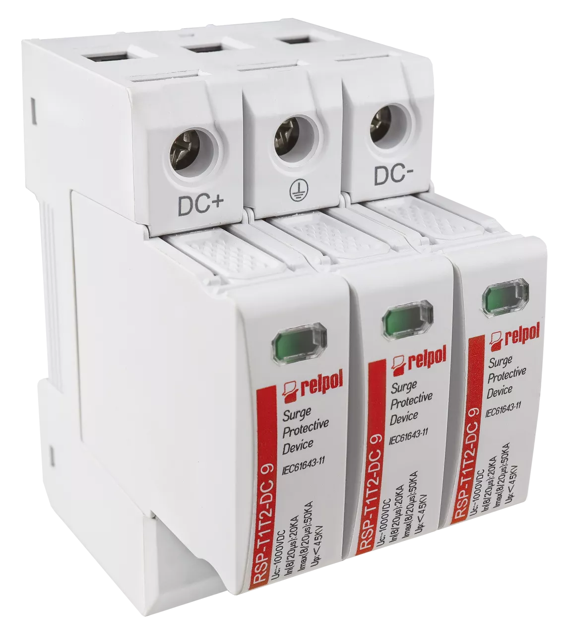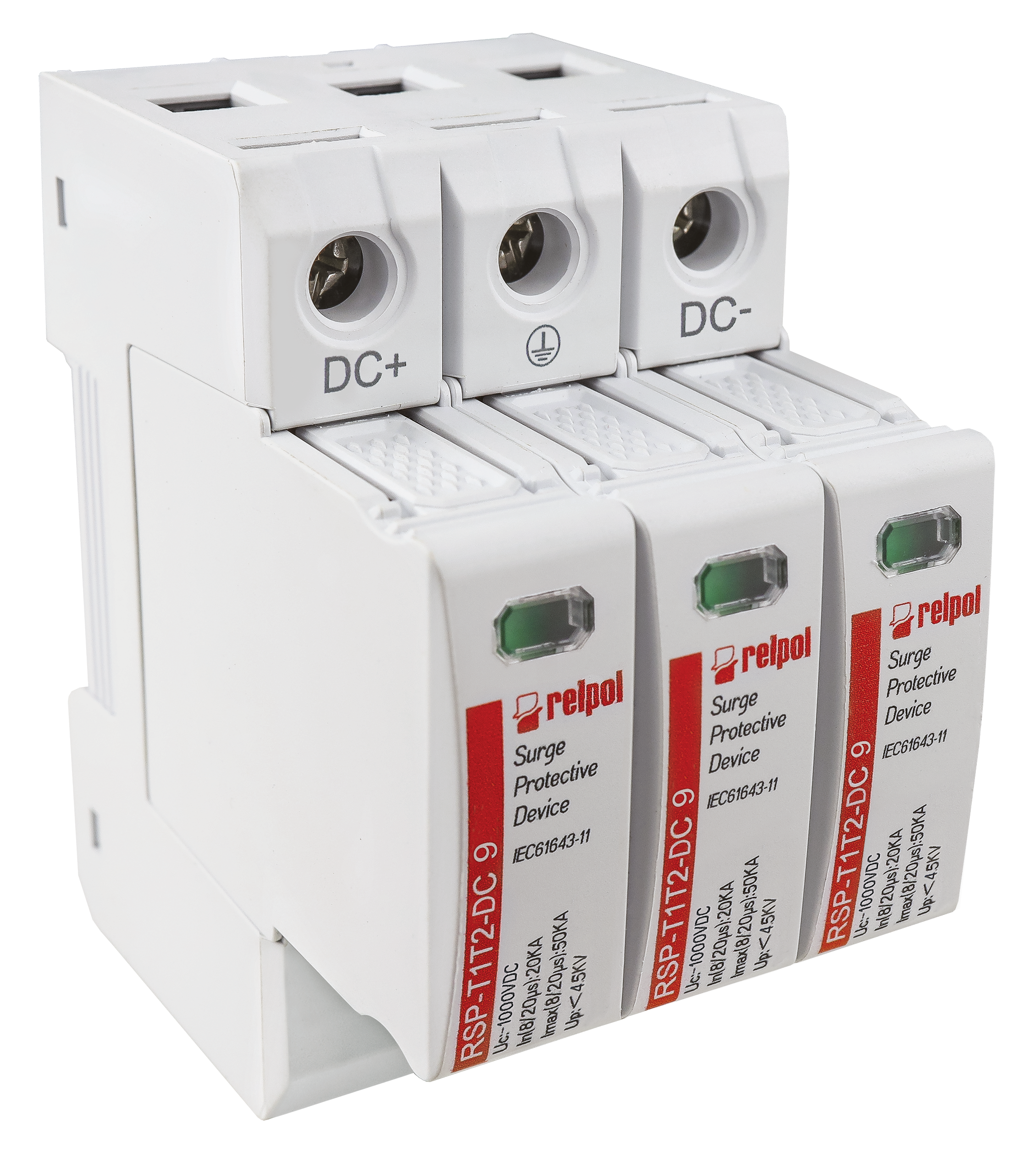 Ogranicznik przepięć do instalacji DC, typ T1+T2, ilość biegunów 3. Prąd szczytowy Iimp:9kA (10/350), prąd całkowity Itotal: 18 (10/350), znamionowy prąd wyładowczy In:20kA (8/20), maksymalny prąd wyłądowczy Imax:50kA, Uc: Maksymalne napięcie pracy trwałej 1000VDC.