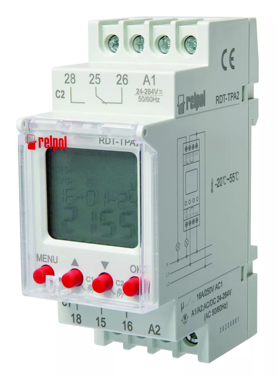 Zegar astronomiczny cyfrowy wielofunkcyjny z programem astronomicznym. 10-letnia rezerwa mocy (bateria litowa). 80 programów. Automatyczne przełączanie czasu letniego/zimowego. Automatyczny transfer dni tygodnia. Podświetlany wyświetlacz LCD (można go wyłączyć). Tryb wakacyjny. Tryb losowy. 2 kanały (do każdego kanału można przypisać indywidualny program). Zasilanie 24-264 V AC/DC. Moduł do montażu na szynie DIN.