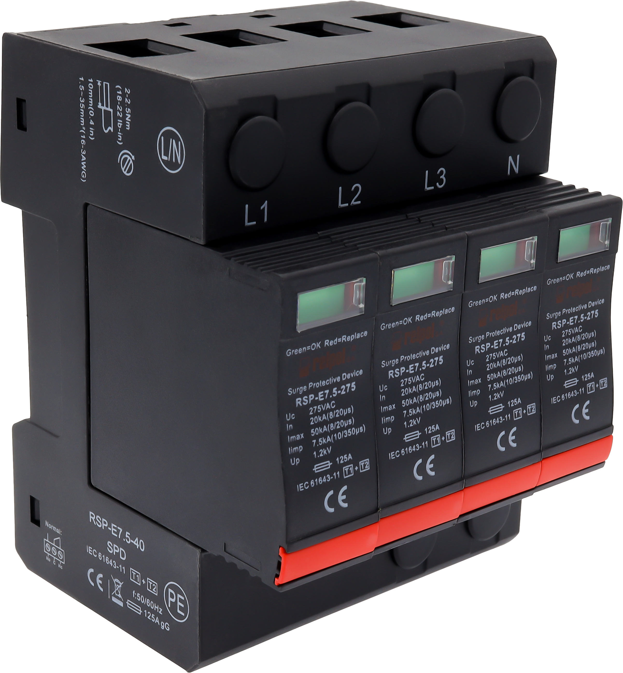 Ogranicznik przepięć do instalacji AC, napięcie znamionowe 230 V AC. Konstrukcja wtykowa Klasa I+ II (T1+T2), liczba biegunów 4. Maks. Prąd wyładowczy Imax 50kA 8/20. Prąd szczytowy 7.5kA 10/350, znamionowy prąd wyładowczy 20 kA. Dla sieci trójazowej „4+0” Uc 275V AC. Technologia MOV ze stykiem bezpotencjałowym do zdalnej sygnalizacji uszkodzenia.