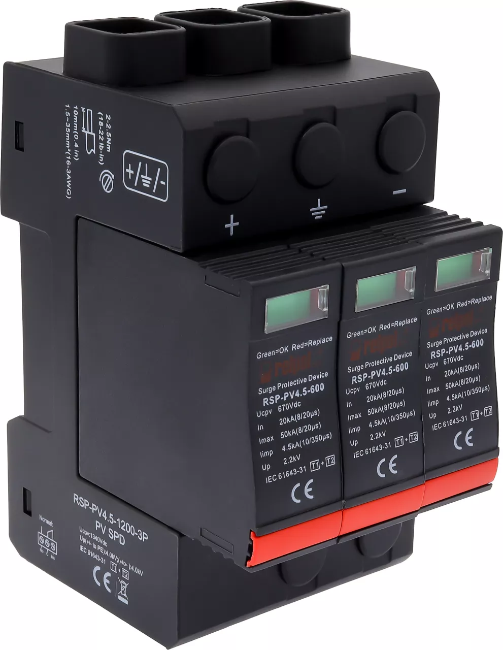 Ogranicznik przepięć typ T1+T2, 3 bieguny, 1200 V DC, Imax: 50kA, In: 20kA, Iimp: 4.5 kA (10/350) RSP-PV4.5-1200-3P