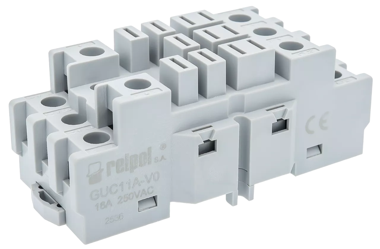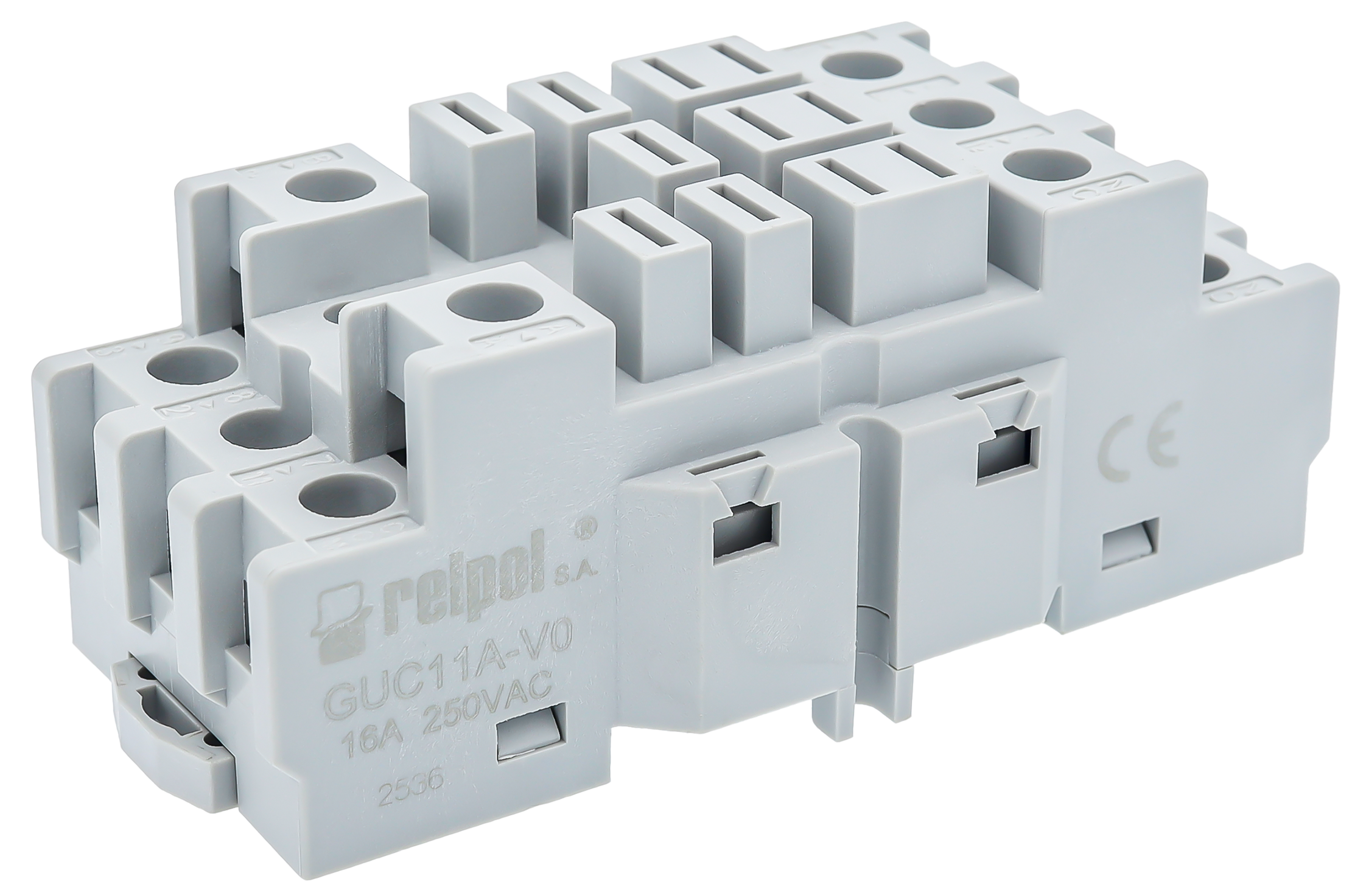 Gniazdo wtykowe, do przekaźników RUC , RUC-M. Stopień ochrony IP 20 . Zaciski śrubowe. Trzy tory prądowe 16 A, 250 V AC / 10 A, 400 V AC. Gniazdo sprzedawane w komplecie z obejmą.