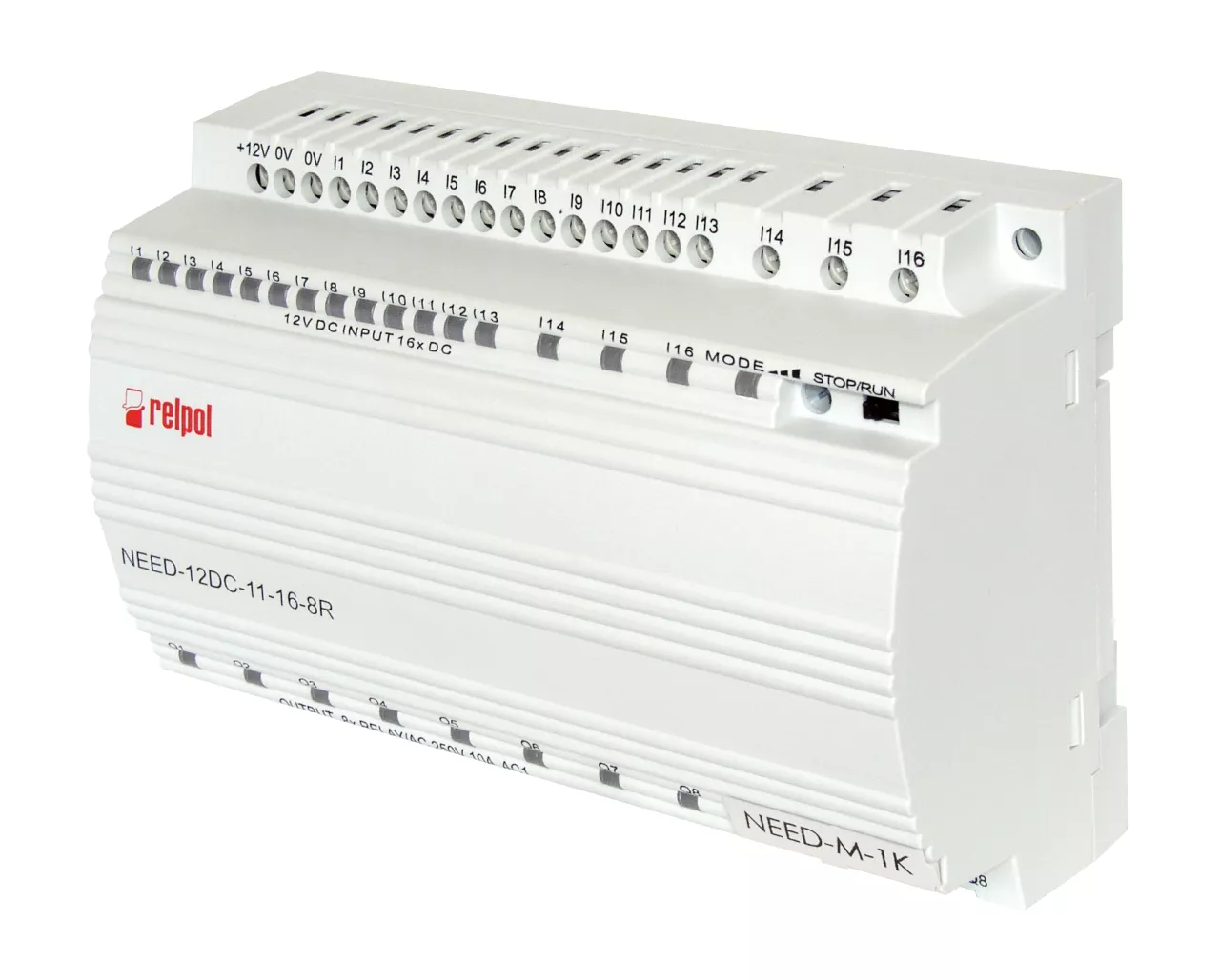 Przekaźnik programowalny w wersji 11. Wejścia - 16, zaciski: I1-I2-I3-I4-I5-I6-I7-I8-I9-I10-I11-I12-I13-I14-I15-I16. Wyjścia - 8 wyjść przekaźnikowych - 10 A / 250 V AC, numeracja wyjść: Q1-Q2-Q3-Q4-Q5-Q6-Q7-Q8 (każde wyjście posiada dwa zaciski). Programowanie: LAD, STL. Napięcie zasilające: 12 V DC - zaciski: (+)L - (-)N. Wskaźniki LED stanu przekaźnika oraz wejść / wyjść. Wymiary: 90 x 132 x 55 mm. Montaż na szynie 35 mm lub wkrętami do płyty. IP 20.