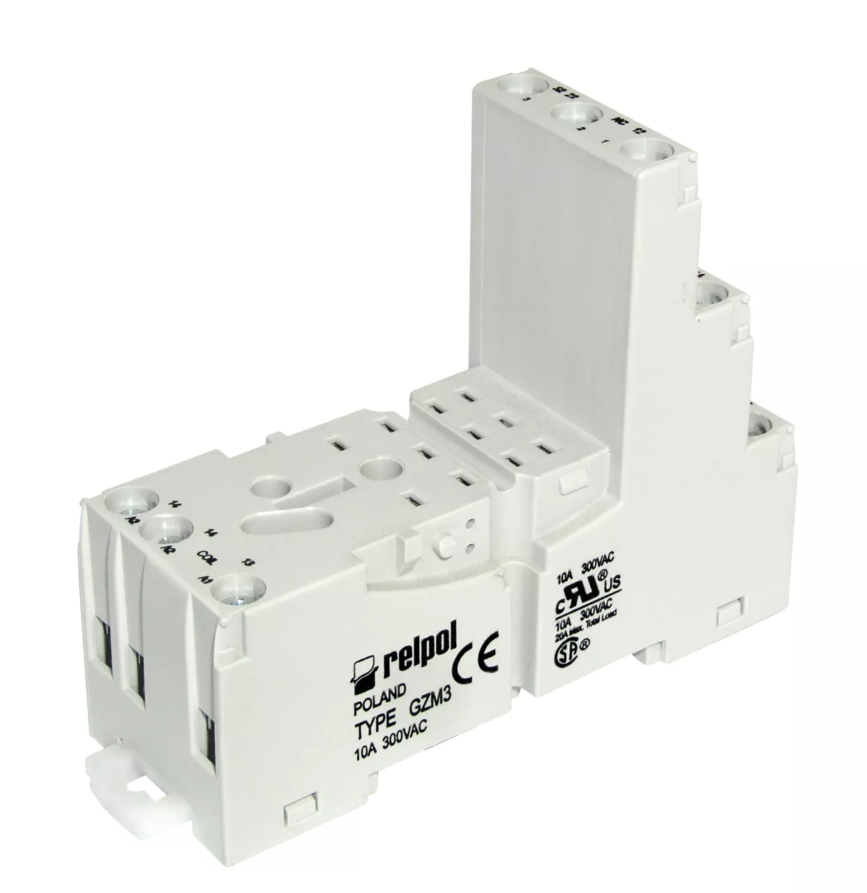 Gniazdo wtykowe, do przekaźnika R3N - szerokość 27 mm. Separacja obwodów - zaciski cewki po jednej stronie, a zaciski styków po przeciwnej stronie gniazda. Wejście / cewka - zaciski: (+)A1(13) - (-)A2(14) - podwójny zacisk A2. Wyjście / styki - zaciski: 11(7)-12(1)-14(4); 21(8)-22(2)-24(5); 31(9)-32(3)-34(6). Obciążalność toru: 10 A / 300 V AC. Montaż na szynie 35 mm lub na płycie montażowej dwoma wkrętami M3. Wymiary zestawu GZM3 + R3N + GZT4-0040: 75 x 27 x 82 mm; zestawu GZM3 + R3 + G4 1052: 75 x 27 x 68,6 mm. Uwaga: do gniazda należy oddzielnie zamawiać obejmę typu GZT4-0040, tzw. wyrzutnikową, z tworzywa lub obejmę sprężynową G4 1052. W gnieździe można instalować moduły sygnalizacyjne / przeciwprzepięciowe typu M...; Zestaw - IP 20.