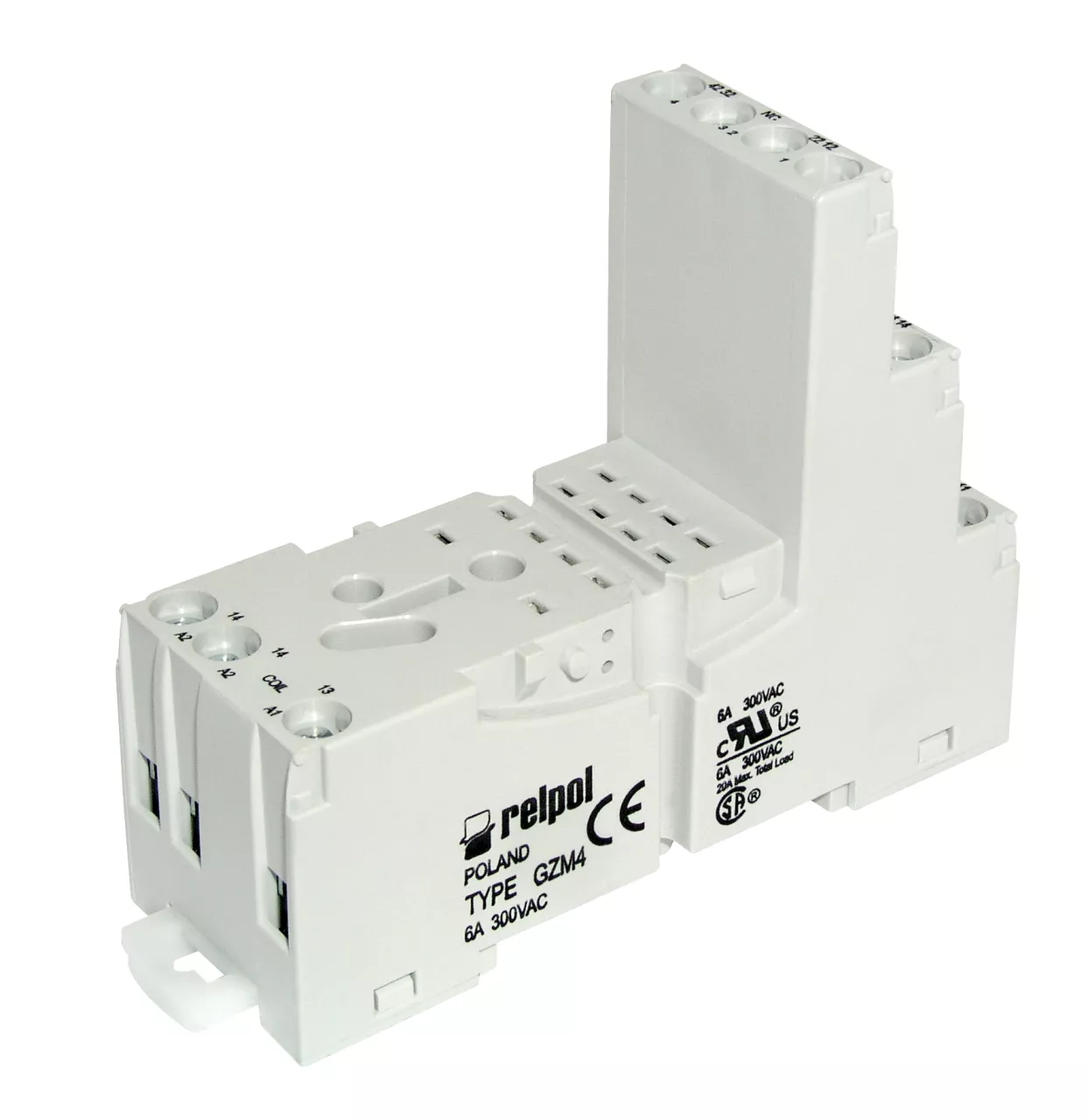 Gniazdo wtykowe, do przekaźnika R4N - szerokość 27 mm. Kolor szary. Separacja obwodów - zaciski cewki po jednej stronie, a zaciski styków po przeciwnej stronie gniazda. Wejście / cewka - zaciski: (+)A1(13) - (-)A2(14) - podwójny zacisk A2. Wyjście / styki - zaciski: 11(9)-12(1)-14(5); 21(10)-22(2)-24(6); 31(11)-32(3)-34(7); 41(12)-42(4)-44(8). Obciążalność toru: 6 A / 300 V AC. Montaż na szynie 35 mm lub na płycie montażowej dwoma wkrętami M3. Wymiary zestawu GZM4 + R4N + GZT4-0040: 75 x 27 x 82 mm; zestawu GZM4 + R4 + G4 1052: 75 x 27 x 68,6 mm. Uwaga: do gniazda należy oddzielnie zamawiać obejmę typu GZT4-0040, tzw. wyrzutnikową, z tworzywa lub obejmę sprężynową G4 1052 lub TR4-2000. W gnieździe można instalować moduły sygnalizacyjne / przeciwprzepięciowe typu M...; Zestaw - IP 20. Pasuje do przekaźników: T-R4, R4N.