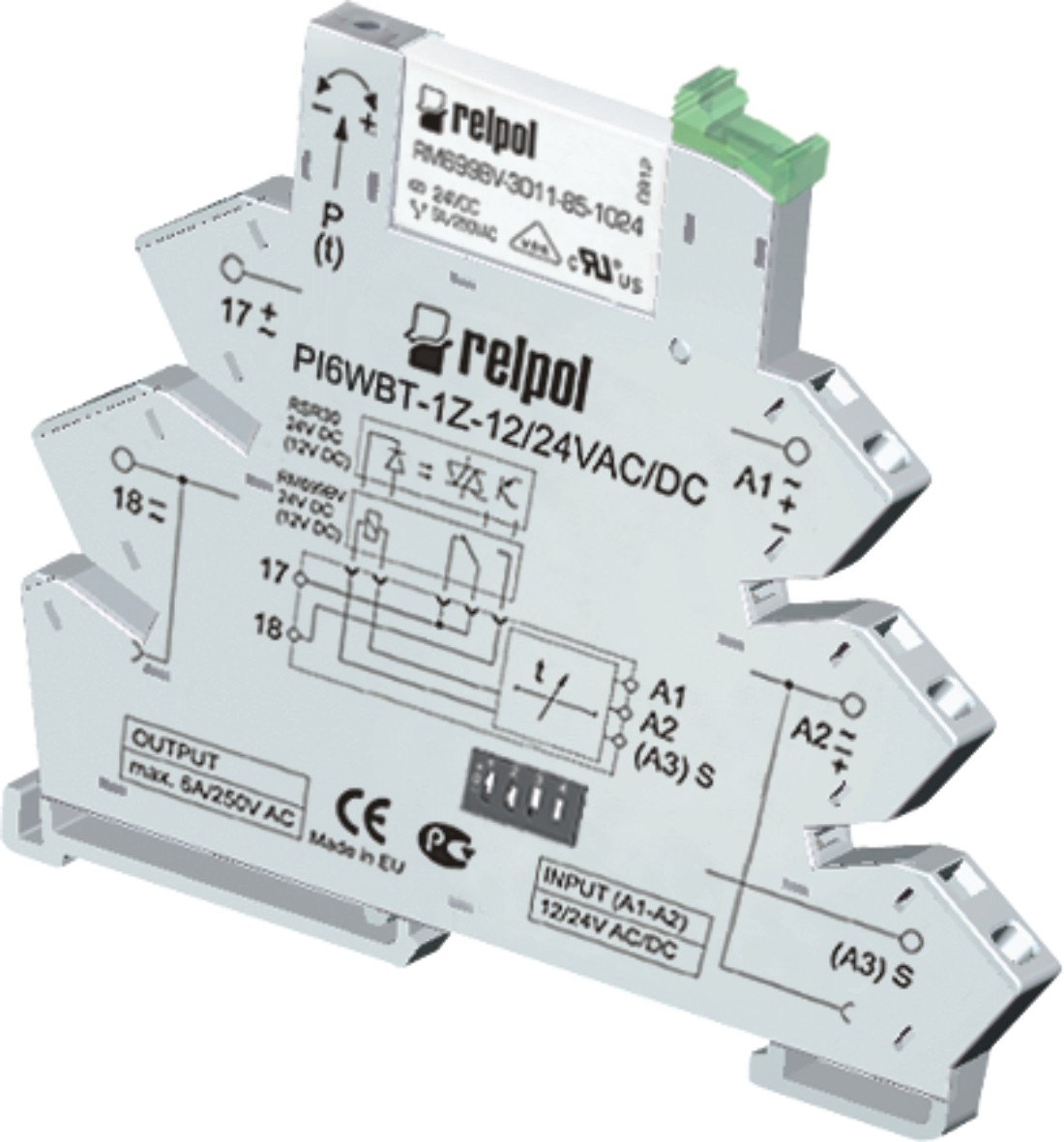 Przekaźnik czasowy wąskoprofilowy, wielofunkcyjny: 1Z - jedno wyjście triakowe 1 A. Szerokość 6,2 mm. Funkcje: E, Wu, Bi, Bp, R, Ws, Wa, Esa, B, OFF - stałe wyłączenie. Zaciski sprężynowe. Wyjście (wymienne - przekaźnik RSR30, oznaczenie w kodzie "T"): triak 1Z - zaciski: (+)17 - (-)18, AC1 - 1 A / 240 V. Wejście - zaciski: A1 - A2; zewnętrzny zestyk sterujący S - zaciski: S(A3) - A1, napięcie zasilania Un - 115 V AC Wymiary: 98,3 x 6,2 x 84,6 mm. Montaż na szynie 35 mm. Obudowa kompaktowa. IP 20.