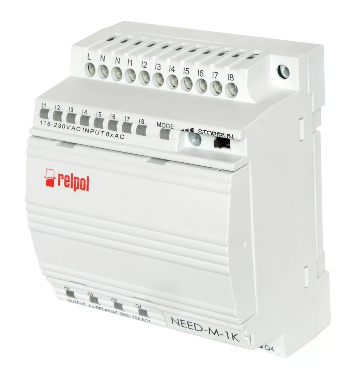 Przekaźnik programowalny w wersji 11. Wejścia - 8, zaciski: I1-I2-I3-I4-I5-I6-I7-I8. Wyjścia - 4 wyjścia przekaźnikowe - 10 A / 250 V AC, numeracja wyjść: Q1-Q2-Q3-Q4 (każde wyjście posiada dwa zaciski). Programowanie: LAD, STL. Napięcie zasilające: 24 V DC - zaciski: (+)L - (-)N. Wskaźniki LED stanu przekaźnika oraz wejść / wyjść. Wymiary: 90 x 72 x 55 mm. Montaż na szynie 35 mm lub wkrętami do płyty. IP 20.