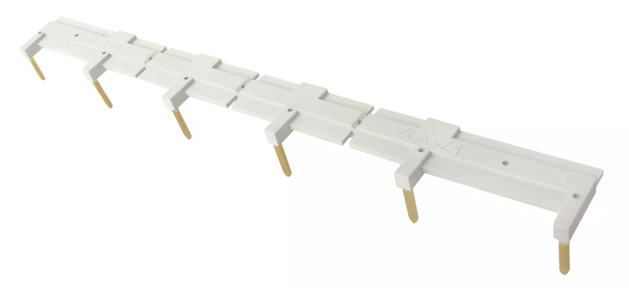 Złącze grzebieniowe 6-zębowe, do mostkowania wspólnych sygnałów wejść (A2), kolor szary. Do gniazd GZT2, GZT3, GZT4, GZM2, GZM3, GZM4 oraz przekaźników interfejsowych PIR2, PIR3, PIR4. Maksymalny dopuszczalny prąd 10 A / 250 V AC.