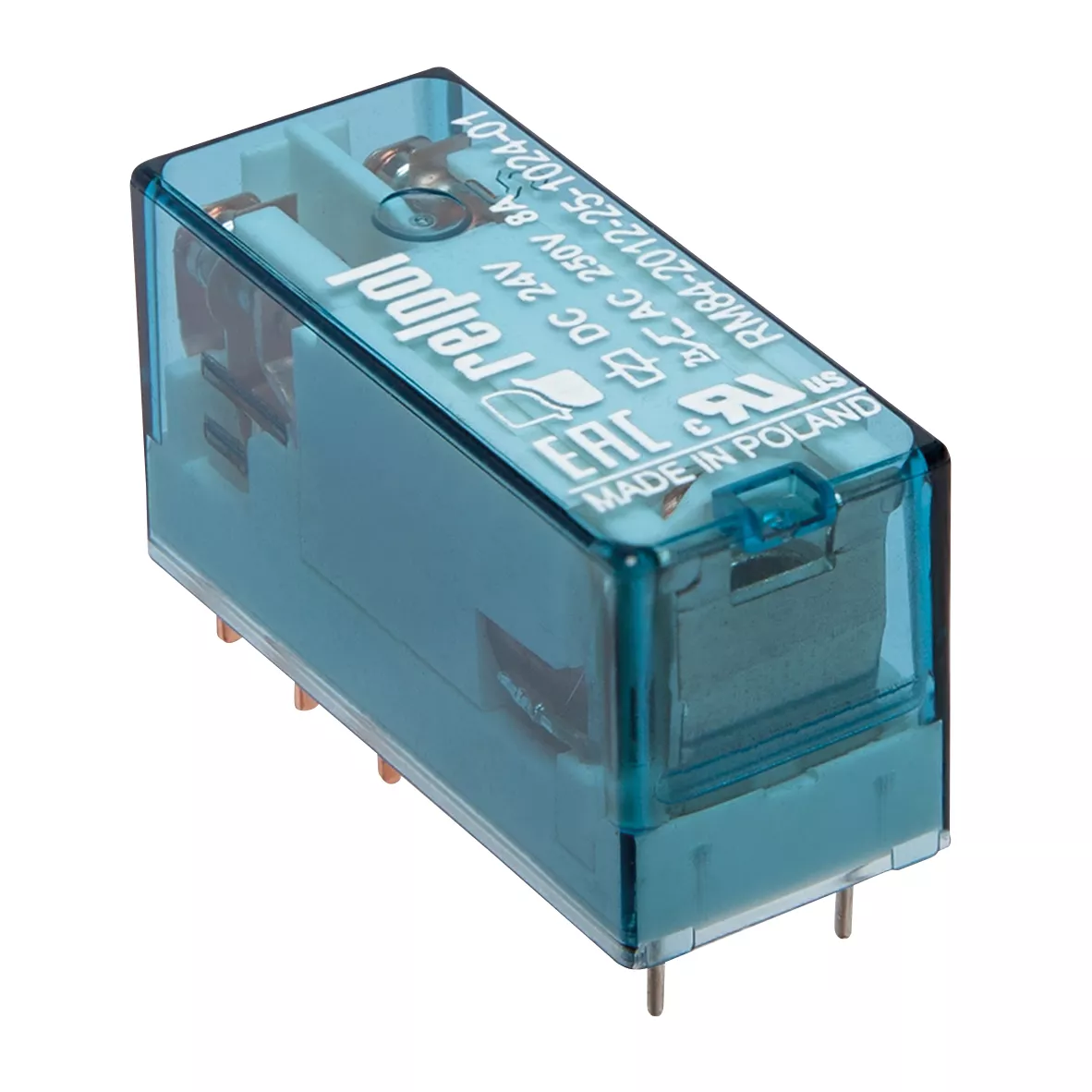 Przekaźnik elektromagnetyczny, miniaturowy w przeźroczystej obudowie (01), do obwodu drukowanego i gniazda wtykowego. Raster 5 mm. Wysokość 15,7 mm. Wyjście: 2P - dwa zestyki przełączne - wyprowadzenia: 11(7)-12(6)-14(8); 21(4)-22(3)-24(5); AC1 - 8 A / 250 V; DC1 - 8 A / 24 V. Wejście / cewka - wyprowadzenia: A1(1) - A2(2), napięcie zasilania Un - 12 V DC. Wymiary: 29 x 12,7 x 15,7 mm. Materiał styków: AgNi. IP 40. Opcje montażu gniazd: EC50, GD50, PW80 - do druku; GZP80 (push-in), GZ80, GZT80, GZM80, GZS80, GZF80 - montaż na szynie 35 mm lub przykręcane do płyty jedną śrubą M3.