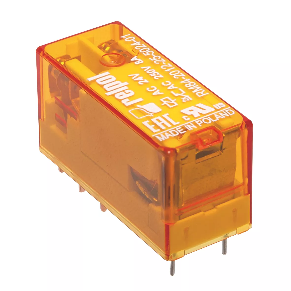 Przekaźnik elektromagnetyczny, miniaturowy w przeźroczystej obudowie, do obwodu drukowanego i gniazda wtykowego. Raster 5 mm. Wysokość 15,7 mm. Wyjście: 2P - dwa zestyki przełączne - wyprowadzenia: 11(7)-12(6)-14(8); 21(4)-22(3)-24(5); AC1 - 8 A / 250 V; DC1 - 8 A / 24 V. Wejście / cewka - wyprowadzenia: A1(1) - A2(2), napięcie zasilania Un - 230 V AC. Wymiary: 29 x 12,7 x 15,7 mm. Materiał styków: AgSnO₂. IP 40. Opcje montażu gniazd: EC50, GD50, PW80 - do druku; GZP80 (push-in), GZ80, GZT80, GZM80, GZS80, GZF80 - montaż na szynie 35 mm lub przykręcane do płyty jedną śrubą M3.