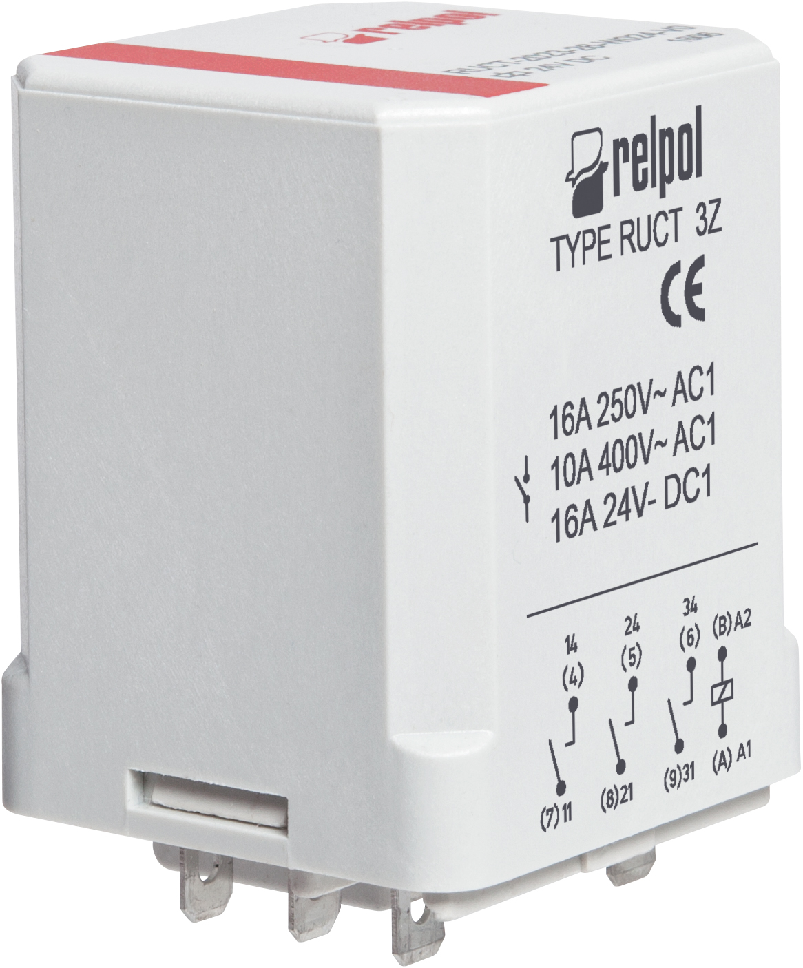 Przekaźnik wykonawczy do zestawu interfejsowego kolejowego PRUCT-2023….. oraz gniazd GUC11S-V0. Trzy zestyki zwierne 3Z. Materiał styków AgNi, Napiece cewki 110 V DC. IP 00. Znamionowy prąd obciążenia: AC1 - 16 A/ 250 V AC; DC1 16 A/ 24 V DC