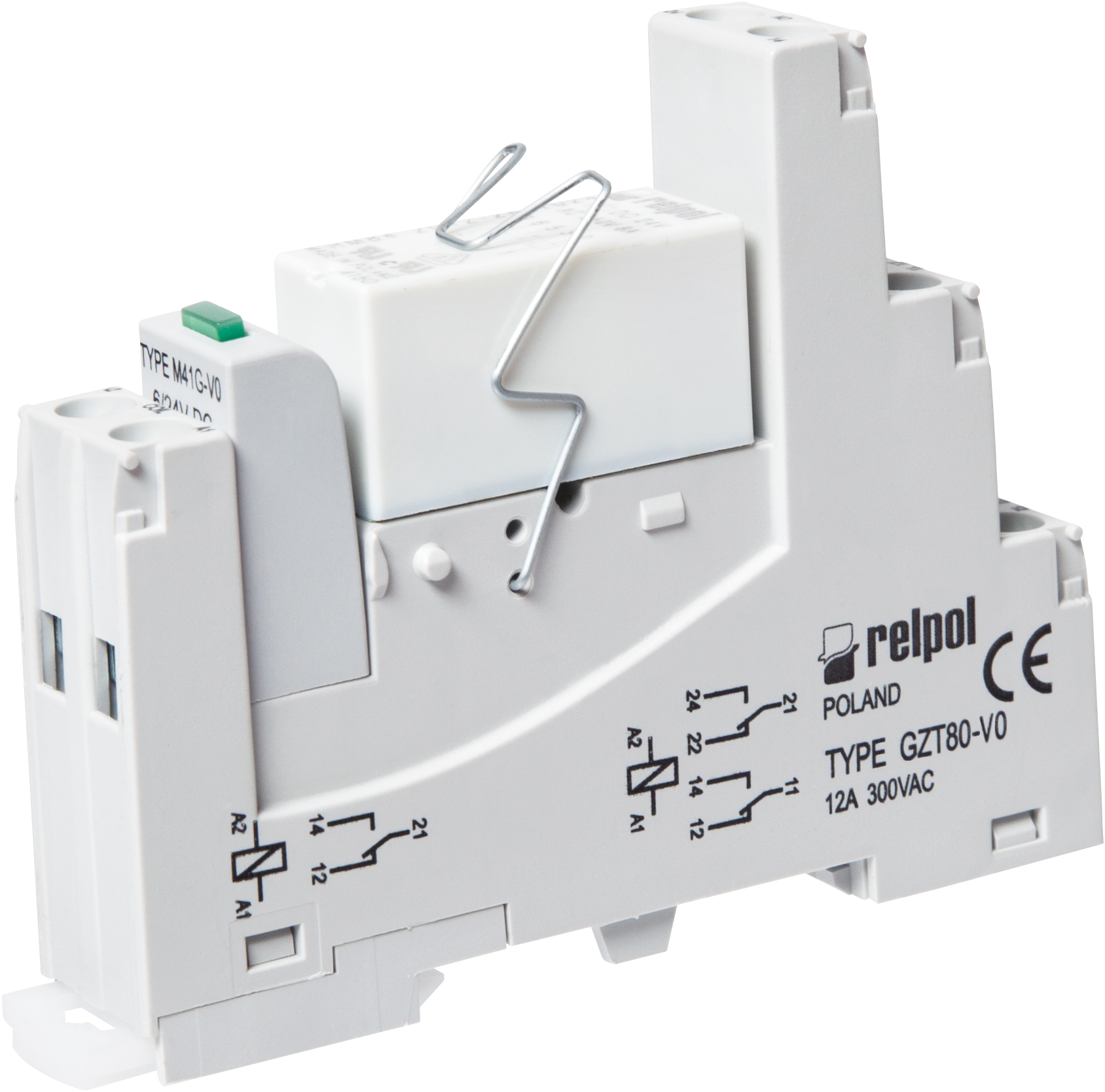 Przekaźnik interfejsowy do zastosowań kolejowych: 1P - jeden zestyk przełączny. Szerokość 15,6 mm. Separacja obwodów - wejście / wyjście. Wskaźnik LED zielony. Dioda D tłumiąca przepięcia. Zaciski śrubowe. Wyjście: styki 1P - zaciski: 11/21-12/22-14/24; AC1 - 16 A / 250 V; DC1 - 16 A / 24 V. Obciążenia zestyku powyżej 12 A wymagają zmostkowania zaciskow śrubowych: 11 z 21, 12 z 22, 14 z 24. Wejście - zaciski: (+)A1 - (-)A2, napięcie zasilania Un - 24 V DC. Wymiary: 80 x 15,6 x 61 mm. Montaż na szynie 35 mm lub na płycie montażowej jednym wkrętem M3. Zestaw zawiera gniazdo GZT80-V0 - IP 20.