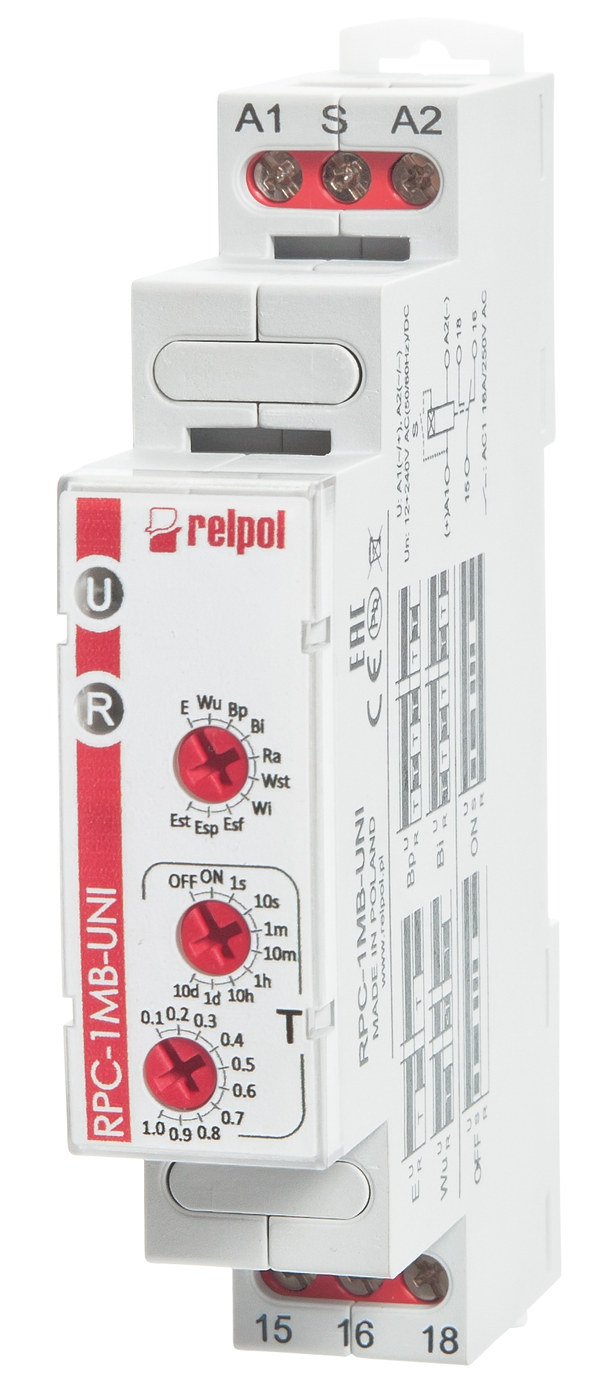 Wielofunkcyjny przekaźnik czasowy - 10 funkcji czasowych E, Wu, Bp, Bi, R, Ws, Wa, Esa, B, T; 8 zakresów czasowych, Wyjście: 1P - jeden styk przełączny. Napięcie zasilania - uniwersalne: 12...240VAC/DC 50/60 Hz. Minimalna moc łączeniowa 1 W 10 mA