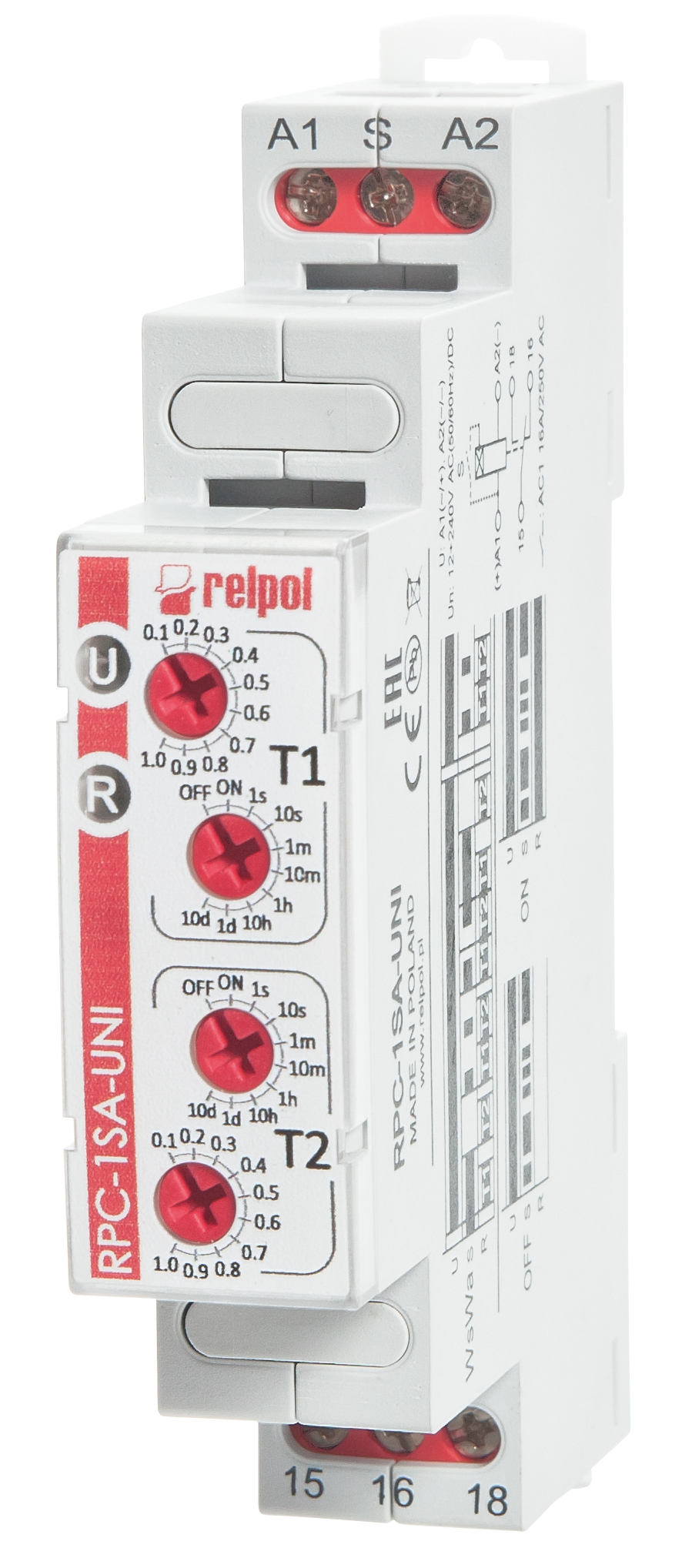 Przekaźnik jednofunkcyjny- dwuczasowy. Funkcja li + lp - praca cykliczna o dwóch niezależnych czasach T1 i T2. Praca z funkcją li lub lp zależna od stanu zestyku sterującego S. 8 zakresów czasowych. Wyjście: 1P - jeden styk przełączny. Napięcie zasilania - uniwersalne: 12...240VAC/DC 50/60 Hz