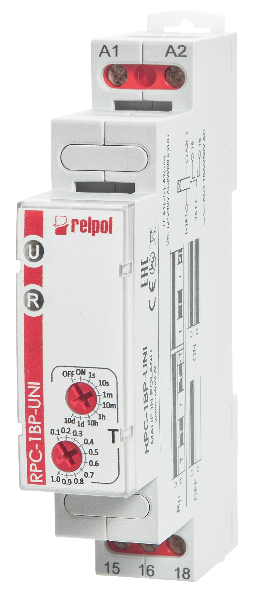 Przekaźnik czasowy – jednofunkcyjny, funkcja Wu- załączenie na nastawiony czas, ON/OFF - stałe załączenie/wyłączenie; 8 zakresów czasowych, Wyjście: 1P - jeden styk przełączny. Napięcie zasilania - uniwersalne: 12...240VAC/DC 50/60 Hz