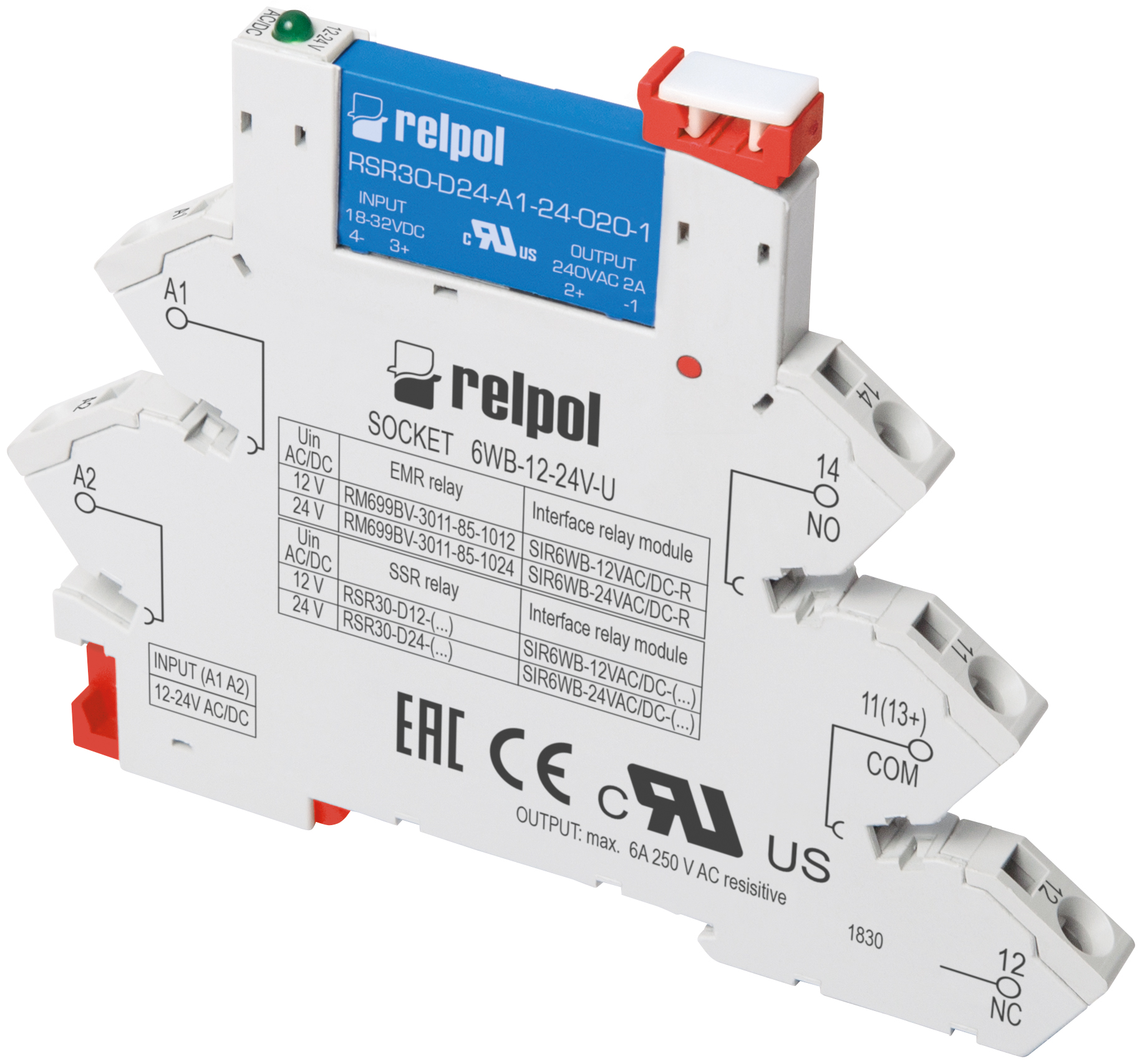 Przekaźnik interfejsowy wąskoprofilowy - zestaw gniazdo 6WB-12-24V-U oraz przekaźnik RSR30-D12-D1-02-040-1. Szerokość 6,2 mm. Zaciski sprężynowe. Wyjście 1 Z - tranzystor (O), maks. 2 A. Zaciski: 14, 11 (13+), 12; AC1 - 6A/250 V; DC1 - 6A/30 V. Wejście - zaciski: A1 - A2 - dowolna biegunowość, napięcie zasilania Un - 12 V AC/DC. Wymiary: 88,6 x 6,2 x 76 mm. Montaż na szynie 35 mm. IP 20.