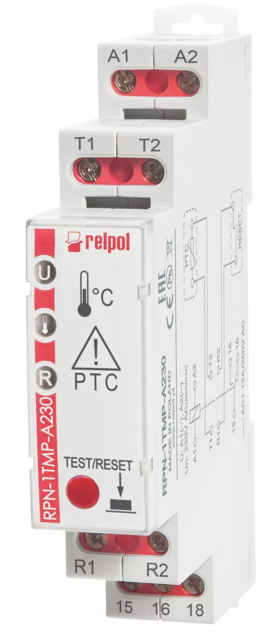 Przekaźniki do nadzoru temperatury silnika. Nadzór zwarcia w obwodzie termistrów (maks. 6 czujników termistrowych PTC, połączonych szeregowo). Wyjście - 1 zestyk przełączny. Napięcie znamionowe 230 AC 50/60Hz. Napięcie zasilania 230 V AC.