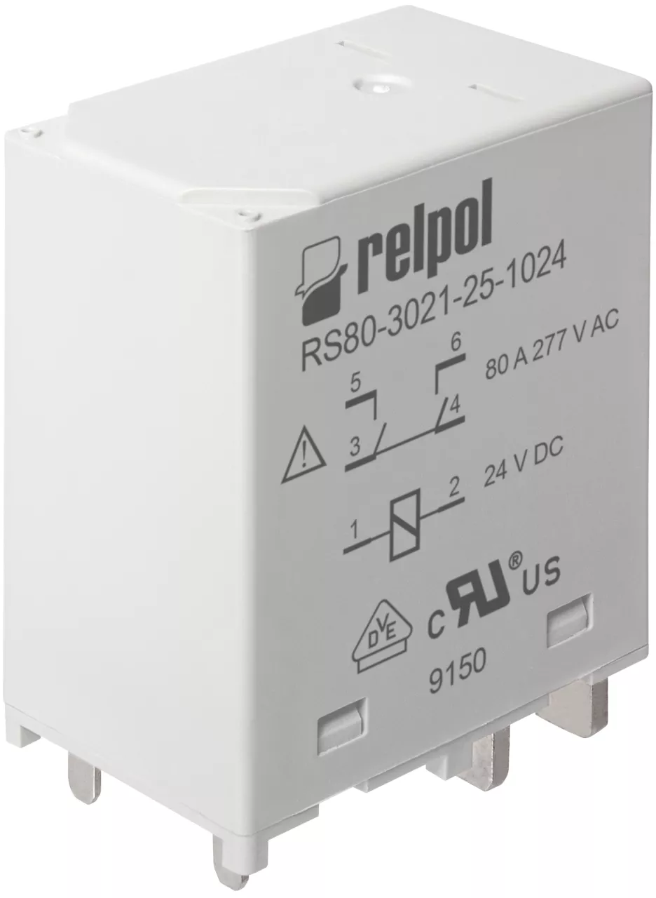 Przekaźnik do inwerterów solarnych i aplikacji wysokoprądowych - 1 zestyk zwierny (1Z) - obciążalność prądowa trwała zestyku: 80 A Cewka 24 V DC. Znamionowy prąd obciążenia w kategorii AC1: 80 A / 250 V AC, DC: 80 A / 24 V DC. Maksymalne napięcie zestyków: 440 V AC. Minimalny prąd zestyków: 10 mA. Przerwa zestykowa ≥ 2,05 mm. Maksymalna moc łączeniowa w kategorii AC1: 20 000 VA. Do obwodów drukowanych