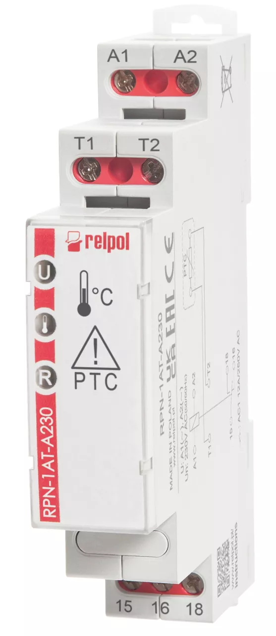 Przekaźniki do nadzoru temperatury silnika. Nadzór zwarcia w obwodzie termistrów (maks. 6 czujników termistrowych PTC, połączonych szeregowo). Wyjście - 1 zestyk przełączny. Napięcie znamionowe 230 AC 50/60Hz. Napięcie zasilania 230 V AC. Automatyczny reset przekaźnika