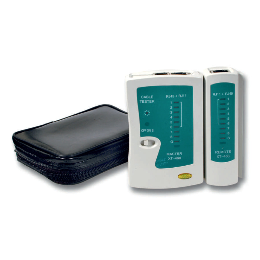 Tester okablowania, Obsługuje złącza typu RJ11/12/45. Każda para przewodów posiada swoją diodę LED. Posiada 2 tryby prędkości skanowania: niski / wysoki. Do działania wymaga zasilania w postaci baterii 9V która nie jest dołączona w zestawie.