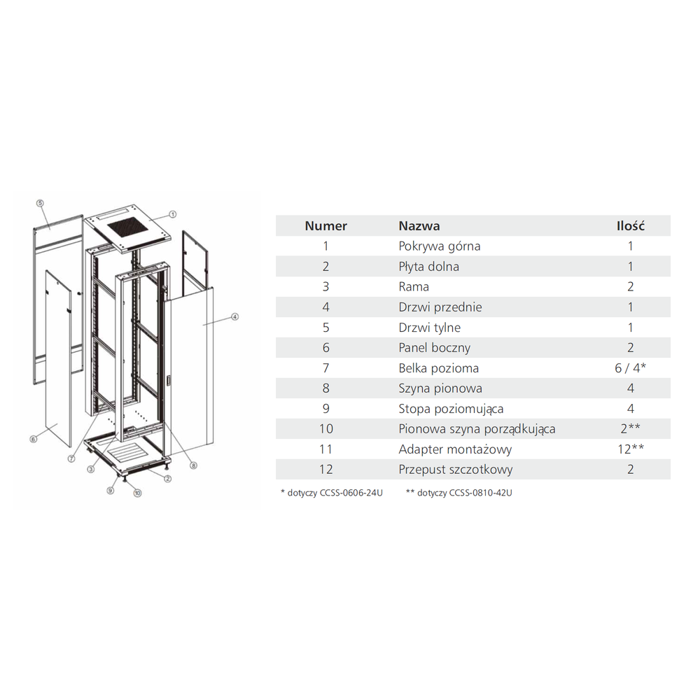 Linia ekonomicznych szaf stojących do zastosowań w instalacjach systemów teleinformatycznych, jak również systemów zabezpieczeń. Szafy CCSS to naturalne uzupełnienie dotychczasowej oferty elementów do budowy sieci teleinformatycznych. Produkty tej serii wymagają samodzielnego montażu, w zamian oferując elastyczną logistykę oraz niskie koszty transportu, zachowując jednocześnie wszystkie cechy funkcjonalne, charakterystyczne dla klasycznych szaf dostarczanych w tradycyjnej formie. Konstrukcja wszystkich szaf została zaprojektowana z myślą o najdrobniejszych szczegółach tak, aby ich montaż oraz eksploatacja przebiegały na wysokim poziomie bezpieczeństwa i komfortu.