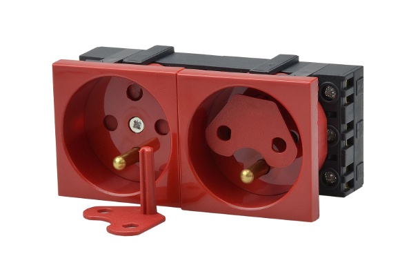 Gniazdo elektryczne z blokadą 2x230V czerwone z kluczem 45x45. Przeznaczone do montażu w systemach 45x45